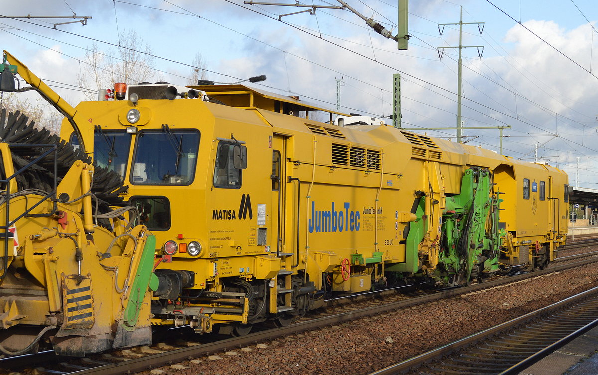 Die MONTI Gleisbau GmbH mit der Universalstopfmaschine P&T Unimat 09-475/4S "Karoline" für Gleise und Weichen und der Schienenschotterplaniermaschine P&T SSP 110 SW "Helene" am 16.05.18 Mönchmühle bei Berlin Richtung Oranienburg.