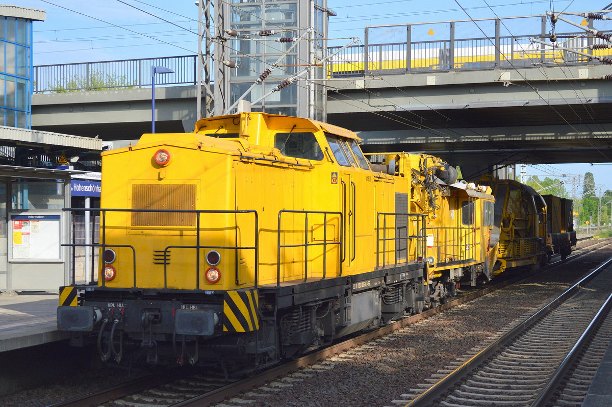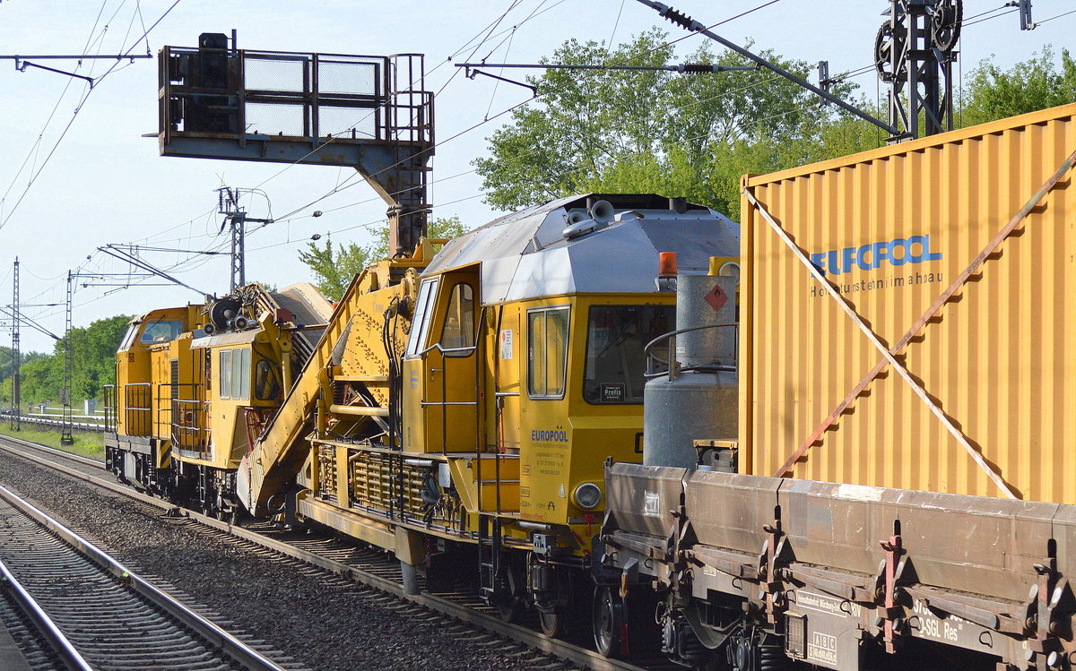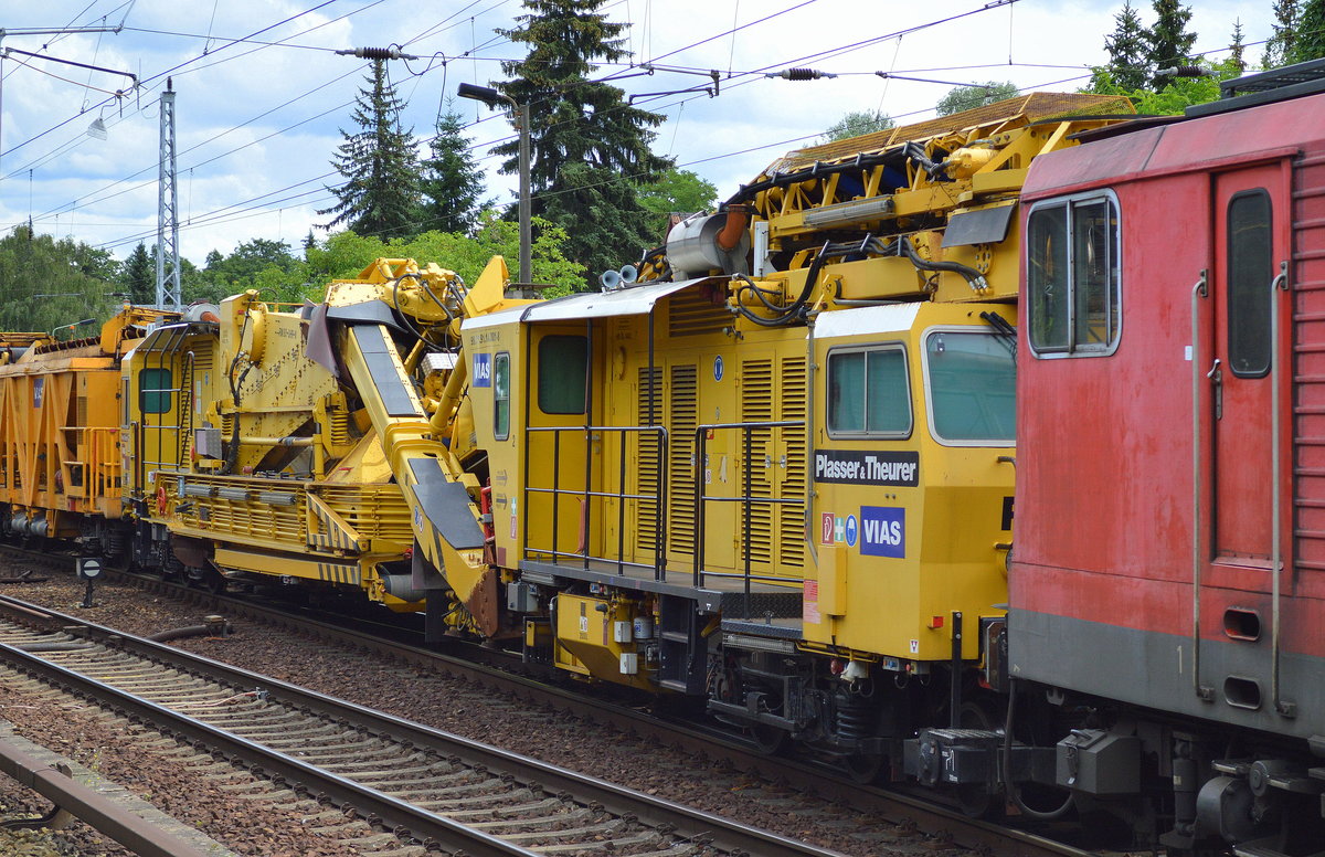 Eine Gleisschotterreinigungsmaschine von P&T Typ RM 80/92 der Fa. EIFFAGE RAIL und mehere Materialförder- und Siloeinheiten in einem Gleisbaumschinenzug am 24.07.13 Berliner Innenring Höhe Berlin Jungfernheide.
