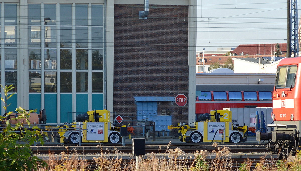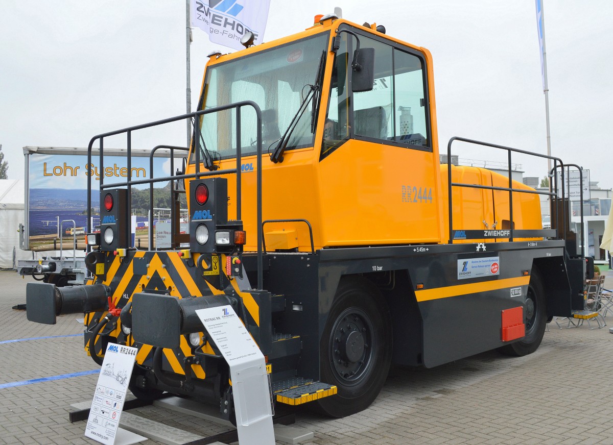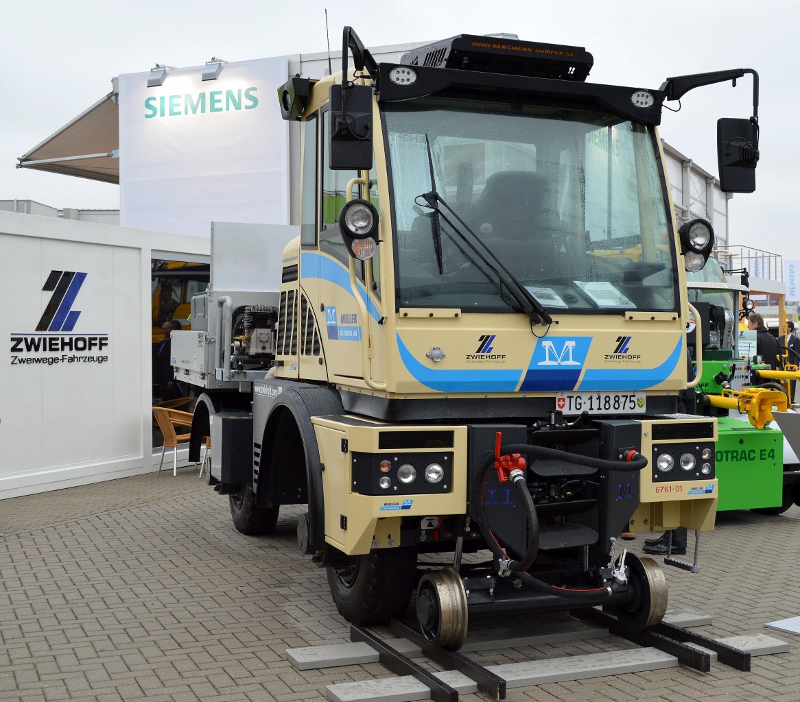 Sieht ein weinig wie ein Ungetüm aus einem Science Fiction Film aus, das Windhoff Zweiwege-Rangierfahrzeug ZRW125DH auf der Inno Trans Berlin, 28.09.14