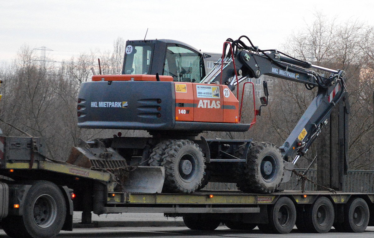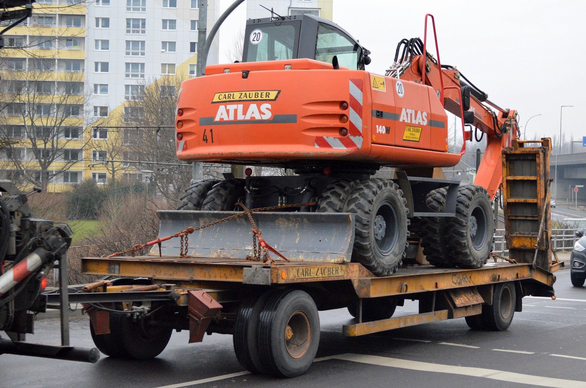 Drehgestell-Flachwagen mit Mobilbagger ALTLAS 160 W der DB Bahnbaugruppe am 20.08.13 Berlin-Pankow.