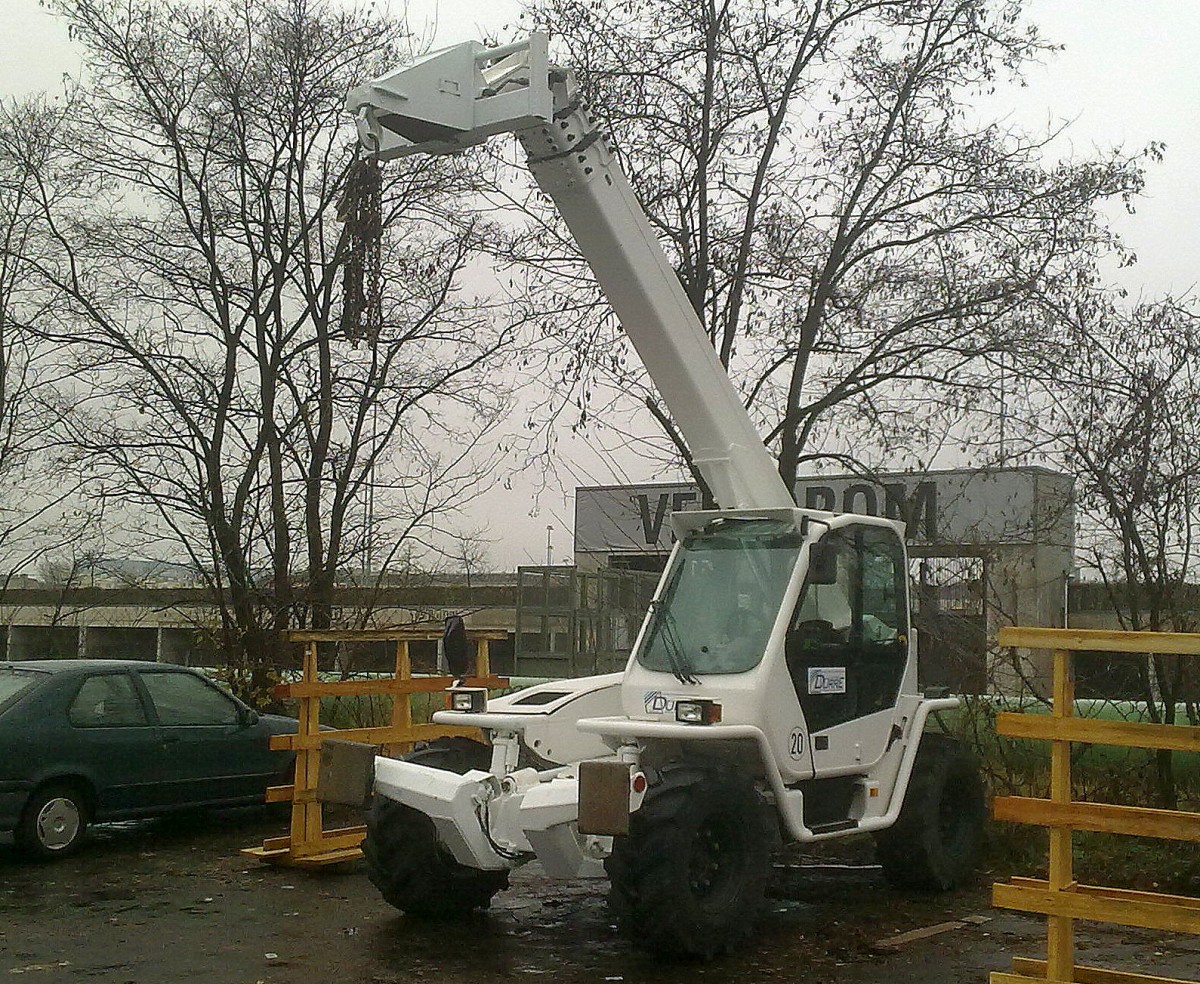 Ein Sonderfahrzeug der Berliner Feuerwehr ist der Teleskoplader vom Typ Merlo Panoramic P 30.7 EVS hier abholbereit auf dem FwA-Tieflader auf dem Betriebshof der Feuerwache Berlin Marzahn (TD 2), da er eigentlich in Charlottenburg stationiert ist (TD 1), 14.12.15