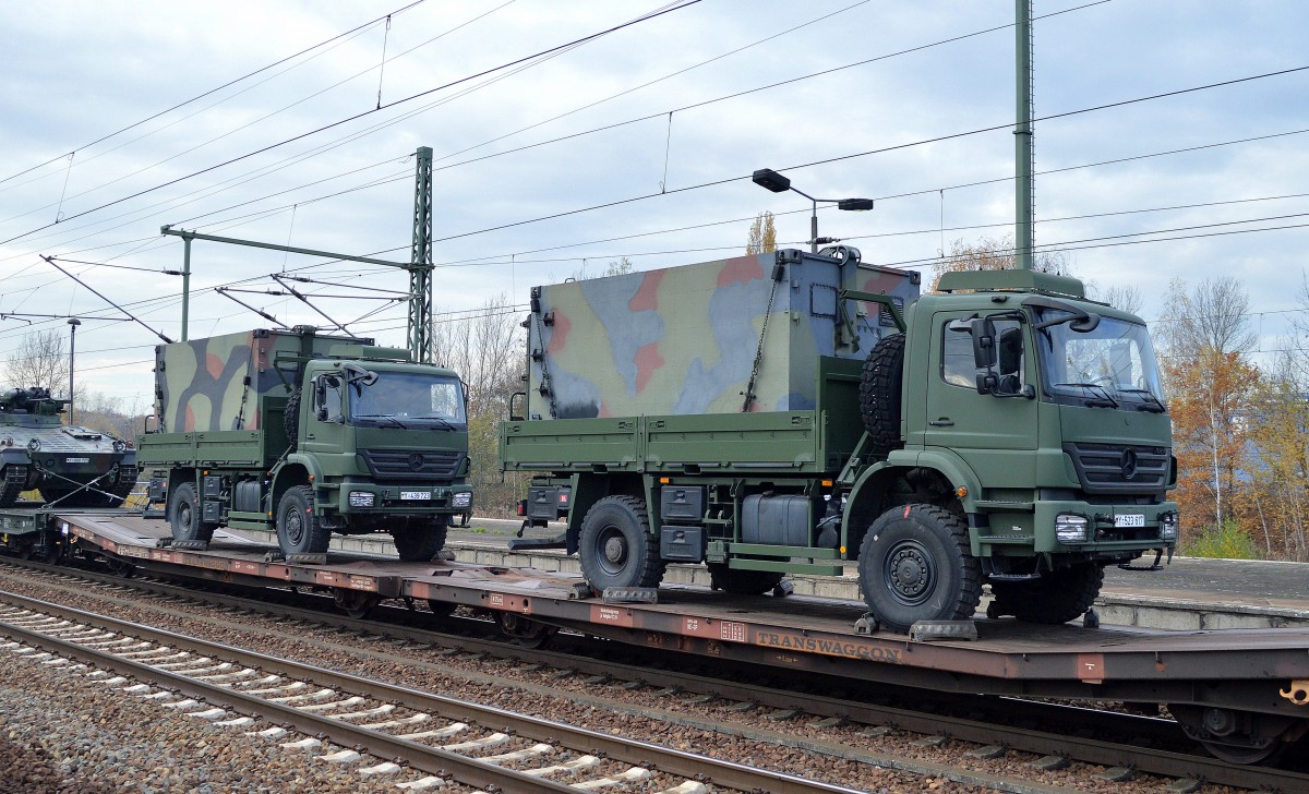 Flachwageneinheit mit abgesenktem Fußboden mit einem MB Axor 1829A (Lkw 5t hümS (BW))+ Hänger der Bundeswehr am 05.11.15 in einem Militärtransportzug im Bhf. Flughafen Berlin-Schönefeld