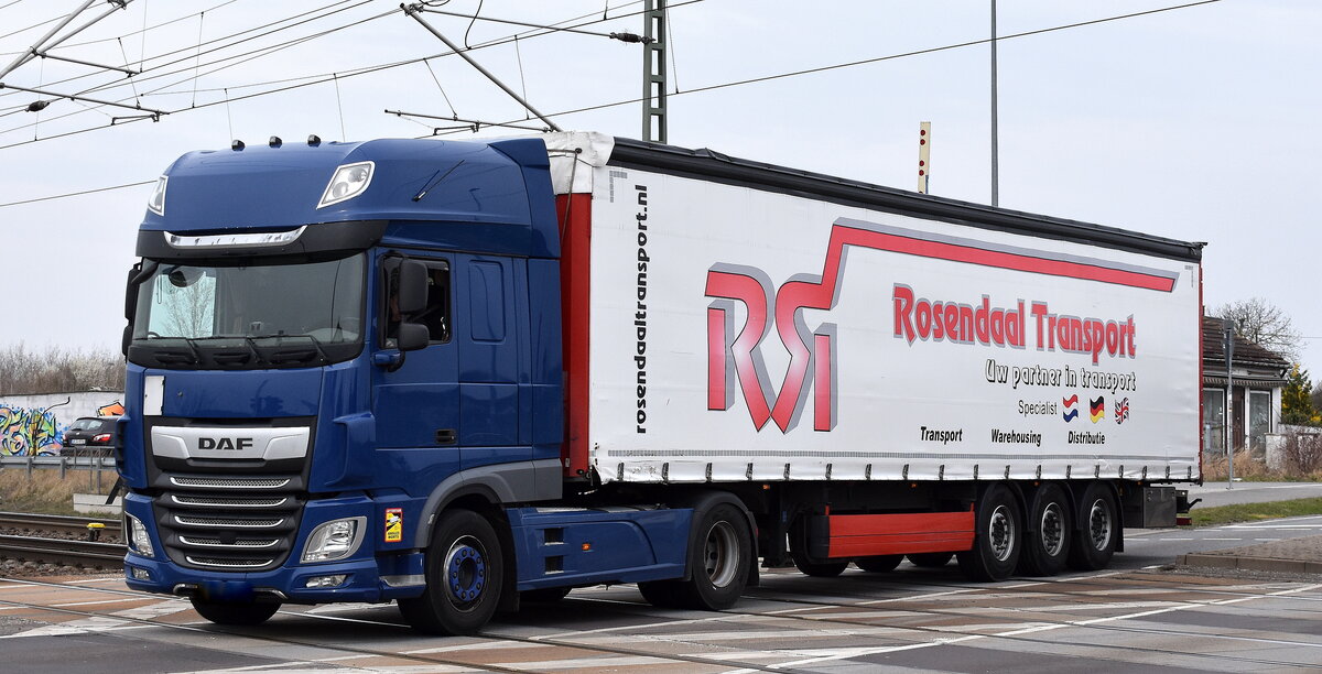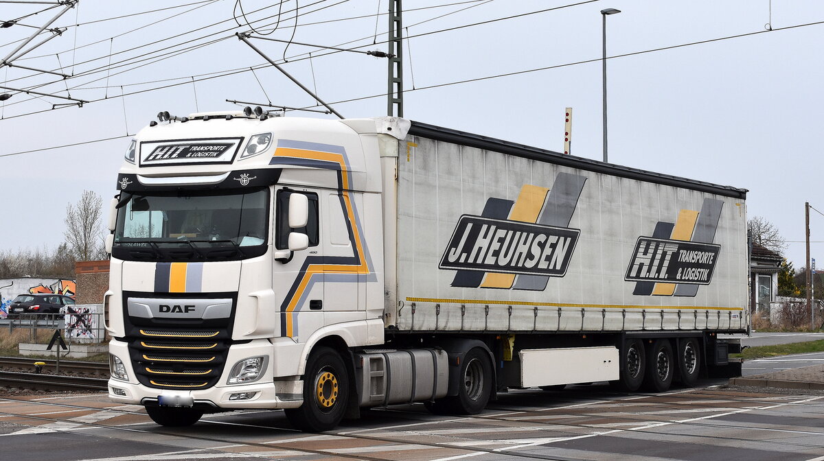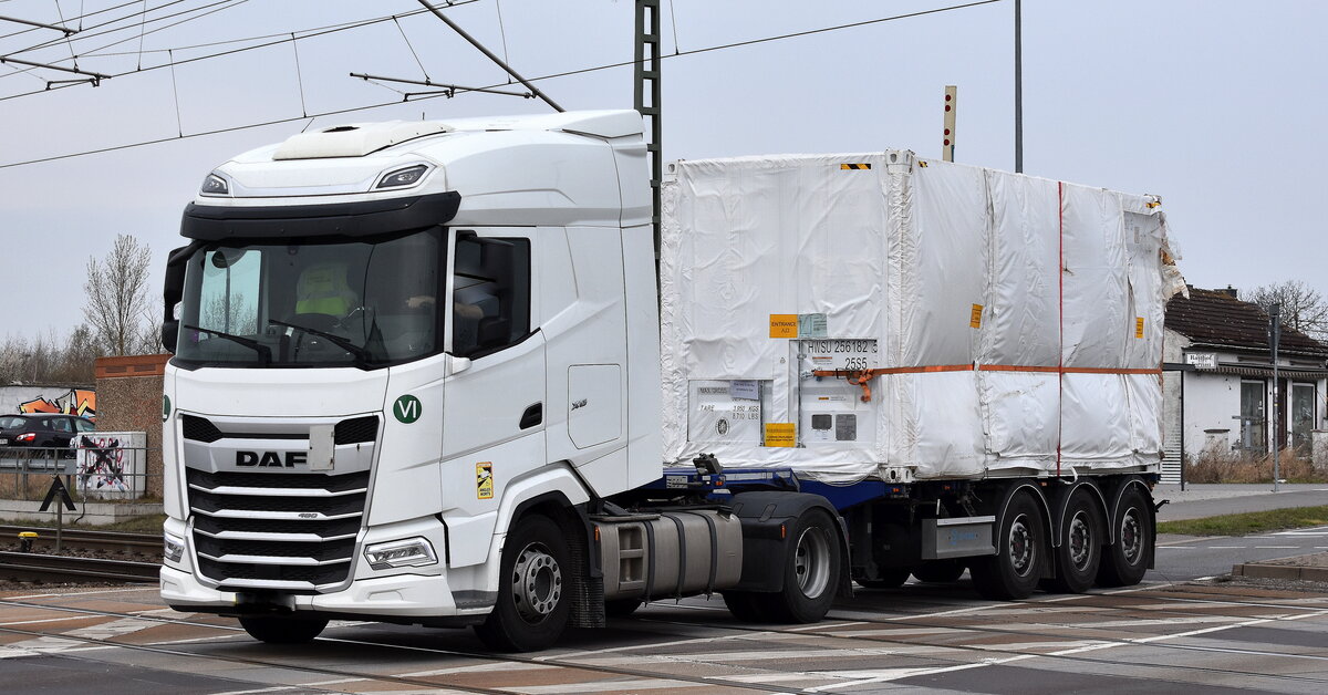 Eine DAF XF Schwerlastzugmaschine mit Tiefladebrückenauflieger der Fa. BTB Logistik GmbH als Begleitfahrzeug eines LIEBHERR Fahrzeugkrans der Fa. BTB, 12.11.12 Berlin-Pankow.