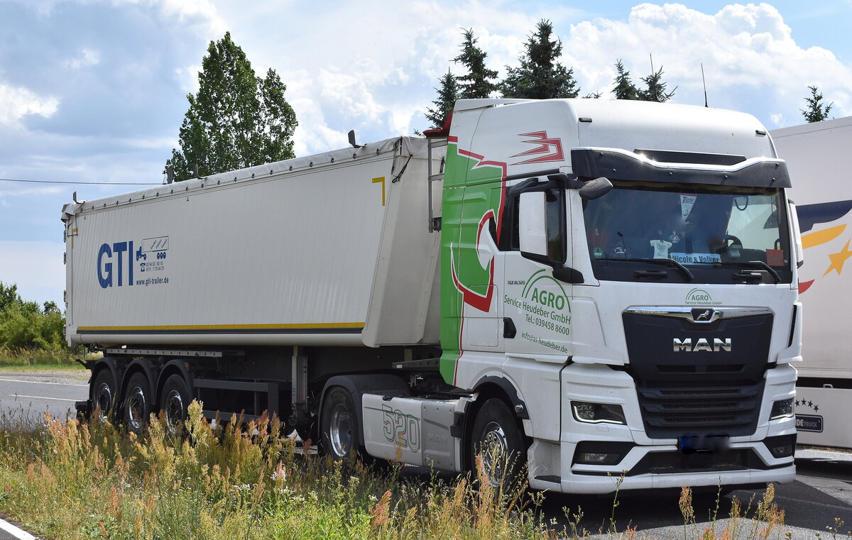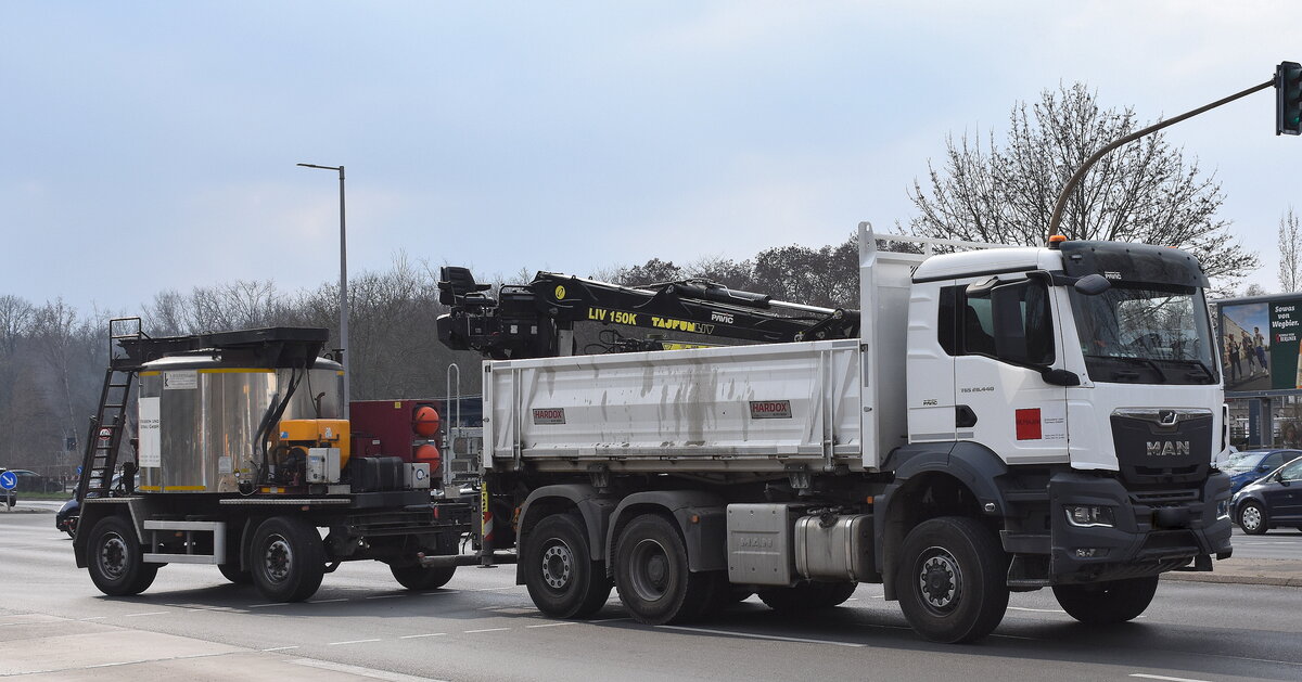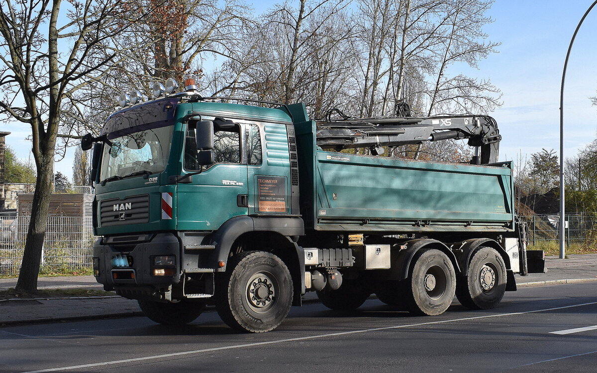 Ein MANN TGM 18.290 Kipper (Selbstlader) mit Straßenwarnschildhänger der Bundesfernstraßenverwalung Land Berlin Autobahnmeisterei Berlin am 07.05.15 Berliner Stadtautobahn Höhe Knobelsdorffstr.