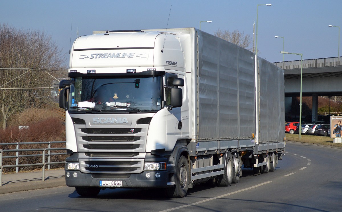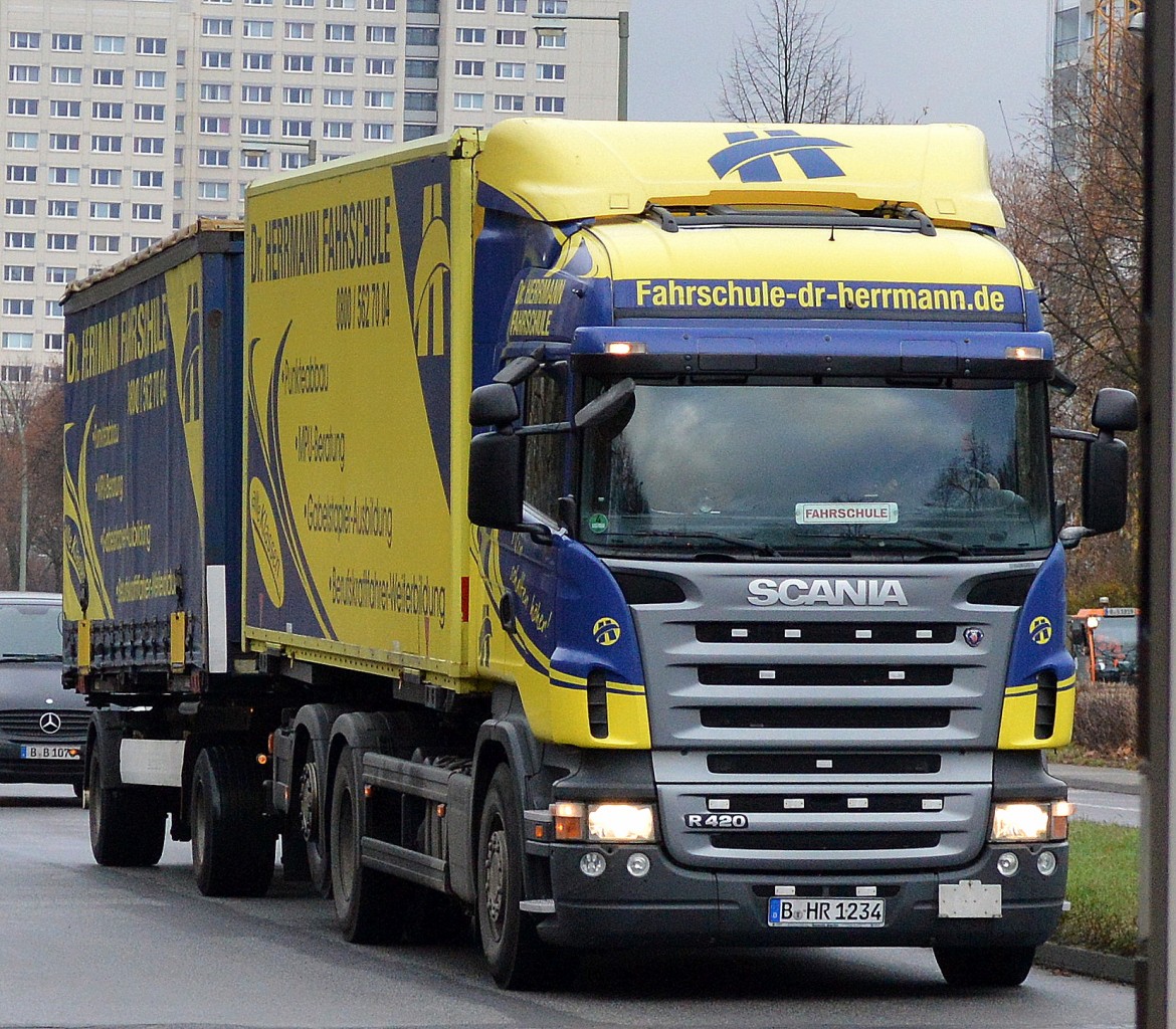 Ein Baustoff-Entsorger mit toll gestalteten Abrollbehältern (Containern). Ein SCANIA R 480 + Hänger am 18.12.25 Bahnübergang Bahnhof Rodleben.