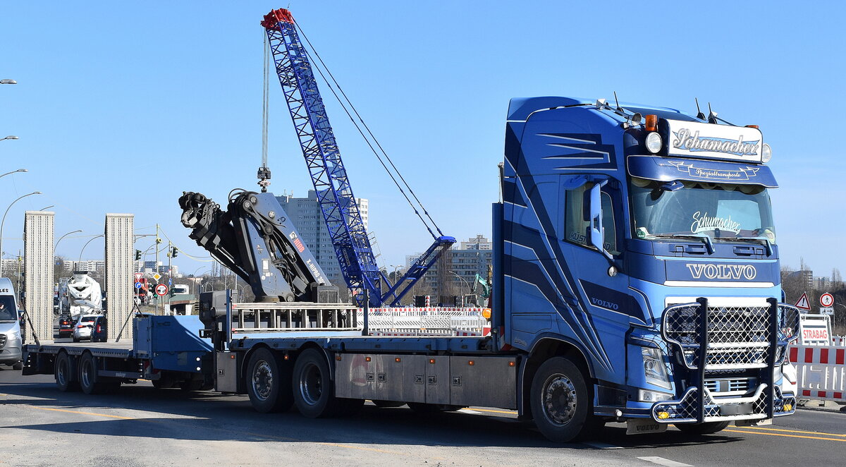 Aus dem Begleittroß des TEREX AC500-2 Fahrzeugkrans der Fa. Gebr.Markewitsch ist dieser VOLVO 520 EURO 5 Schwerlast-LKW mit Hydraulikgreifarm, 23.10.10 Berlin-Baumschulenstr.