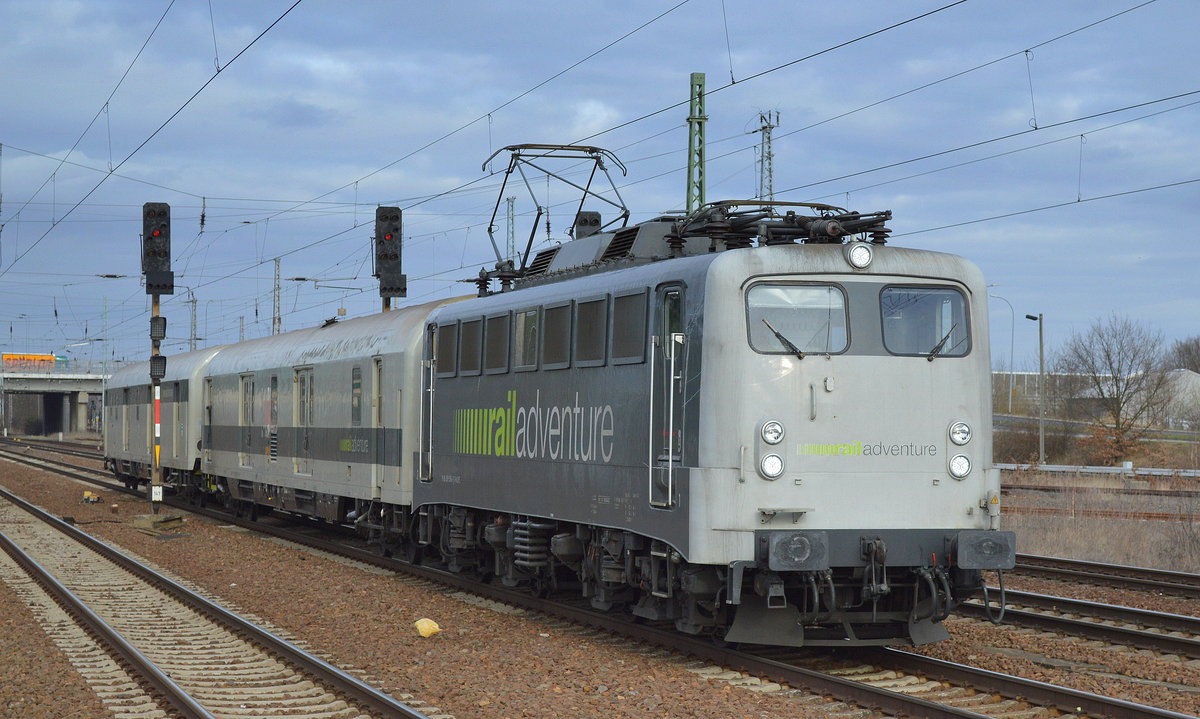 Seit 2012 ist die schöne graue 139ér schon in Diensten von RailAdventure, einem Münchener Unternehmen spezialisiert auf Event- und Überführungsfahrten + spezielle Messfahrten für die Bahn in Europa. Die 139 558-1 (91 80 6139 558-1 D-RADVE, Krauss-Maffei Ag Bj.1964) mit firmeneigenen Schutzwagen und zwei PESA LINK II für die Oberpfalzbahn am 11.09.14 Bhf. Flughafen Berlin-Schönefeld.