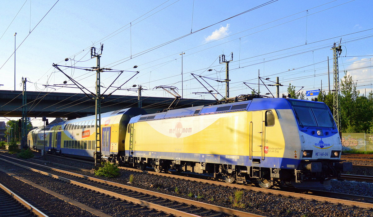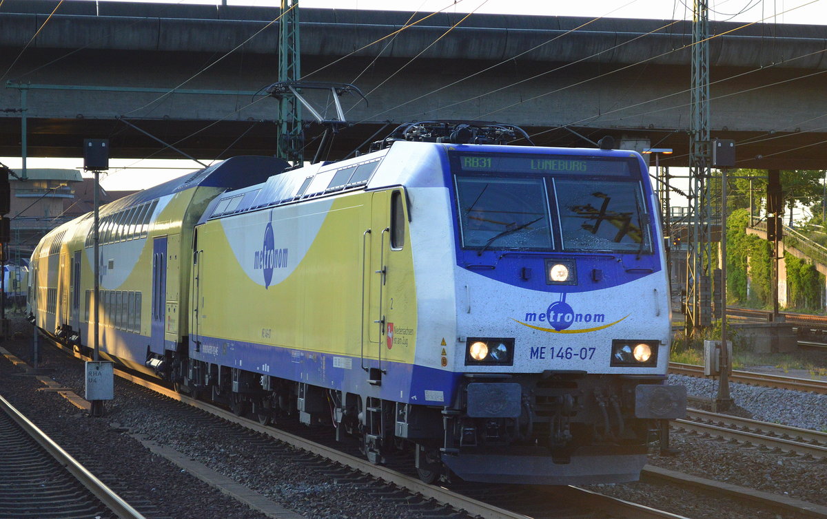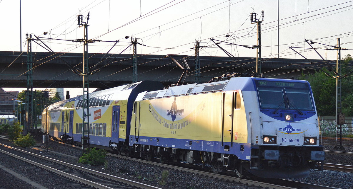 Als Schublok, die metronom ME 146-18/146 518-6 mit Regionalzug bei der Einfahrt Bf. Hamburg-Harburg am 20.06.17