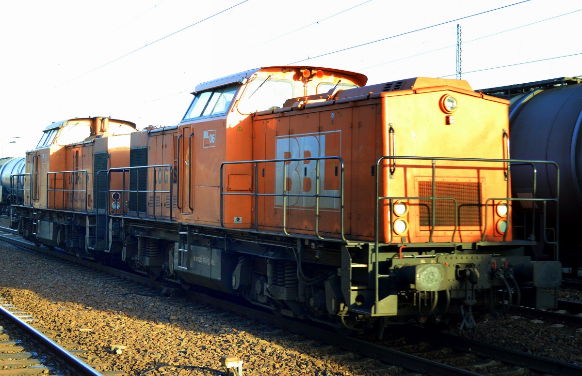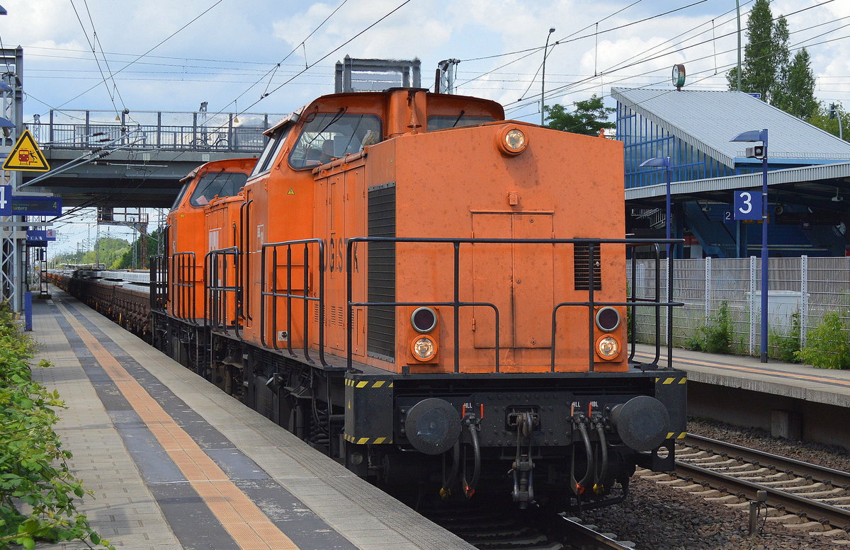 BBL 14 (214 025-9) mit einigen Drehgestell-flachwagen mit Gleisschotter beladen am 13.10.14 Berlin-Hohenschönhausen.