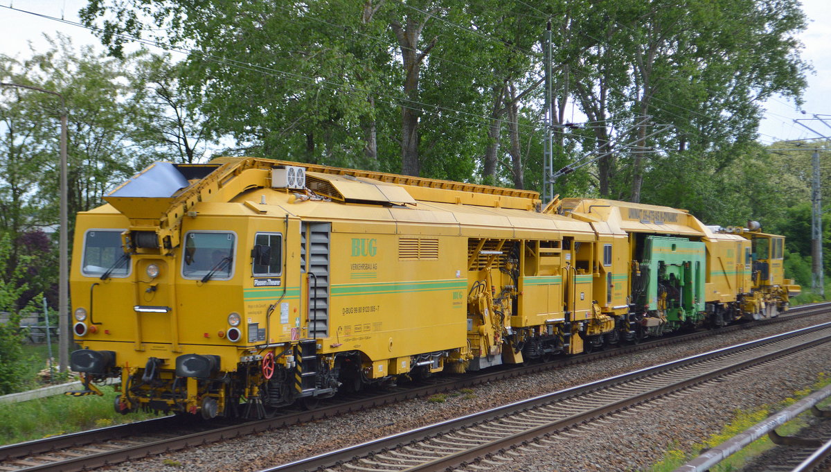 Fa. BUG mit einem ATLAS Zweiwegebagger Typ 1604KZW mit Beiwagen (Baustellen-Lore) und zweiachsigem Güterwagen am 27.04.17 Bf. Berlin-Lichtenberg.