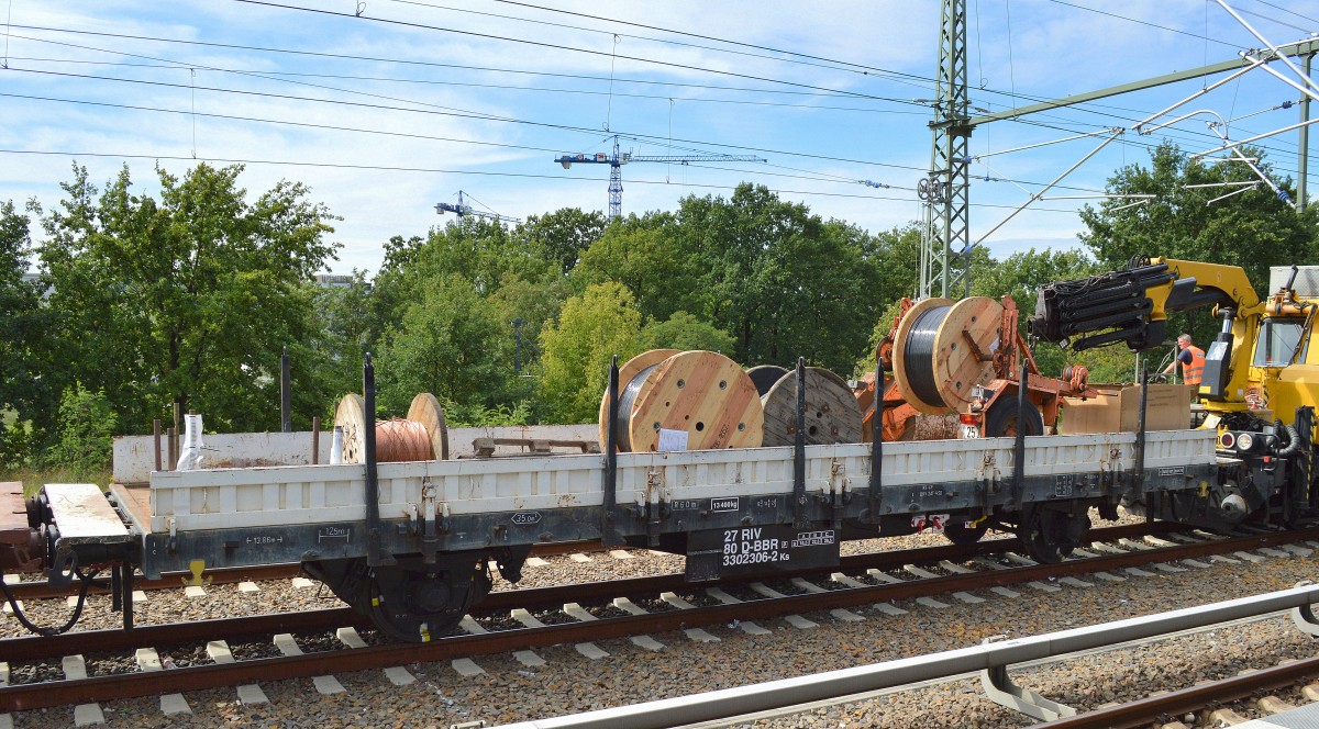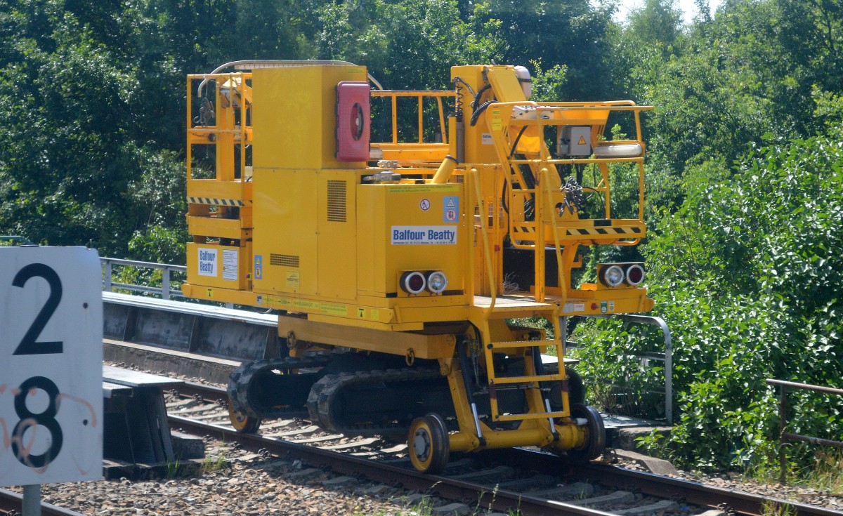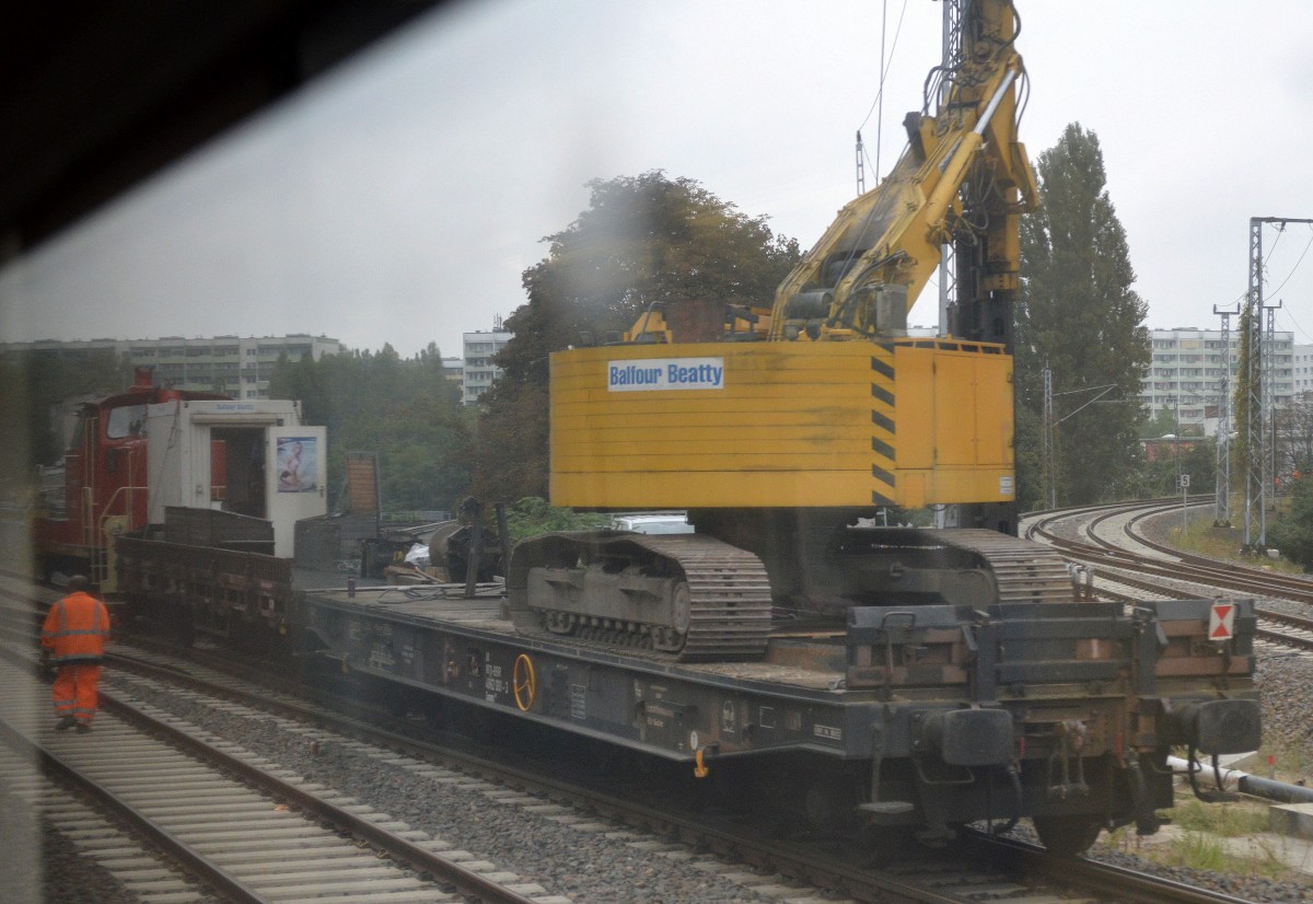 Ein Drehgestell-Flachwagen der Fa. Balfour Beatty mit der Nr. 31 80 4863 876-7 D-BBR mit einem Raupenrammgerät vom Hersteller DELMAG Typ G42 der Fa. Balfour Beatty am 27.06.13 Berlin-Springpfuhl.