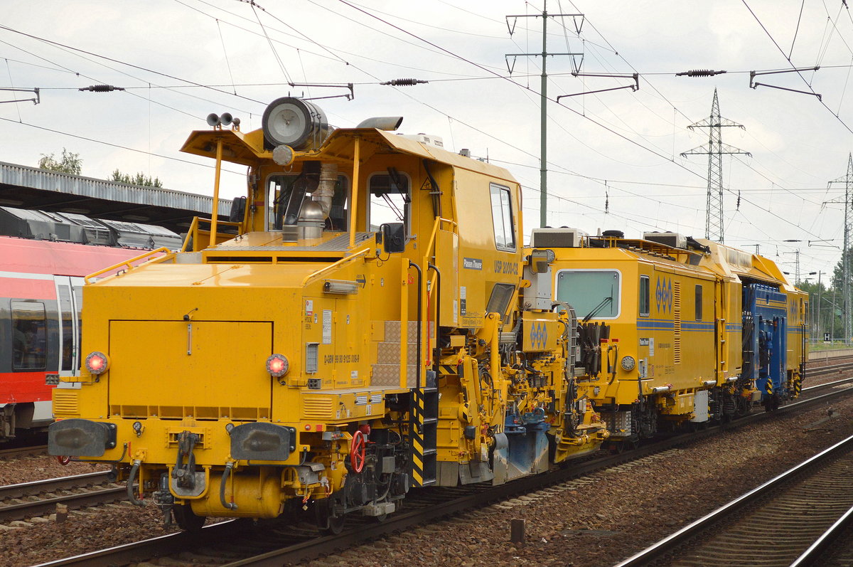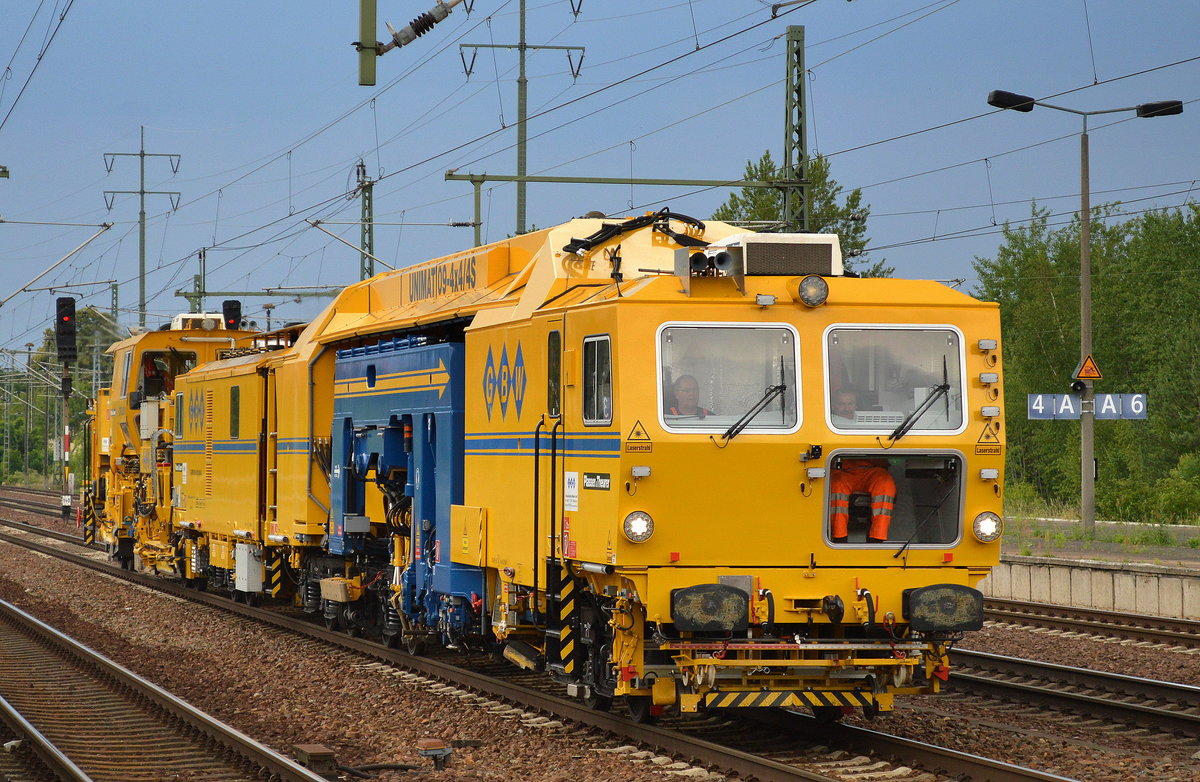 Die Fa. GBW mit der Schnellschotterplaniermaschine P&T SSP 110SW vorneweg und ihrer P%T UNIMAT 09-475/4S Stopfmaschine Richtung Berlin-Blankenburg am 26.08.14 Berlin-Pankow.