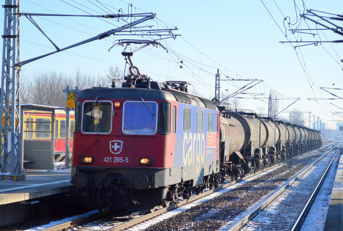 Re 421 397-1 für HSL mit Kesselwagenzug (geschmolzenes Schwefel) am 29.04.16 Berlin-Karow.