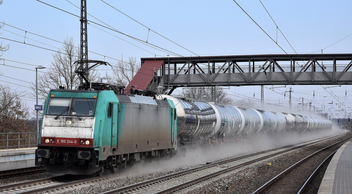 Transchem Sp. z o.o., Włocławek [PL] mit der geleasten polnischen ATLU Lok "E 186 250-7" [NVR-Nummer: 91 51 5270 003-4 PL-TM] und einem Kesselwagenzug (für Benzol) am 29.10.25 Höhe Bahnhof Frankfurt/Oder.