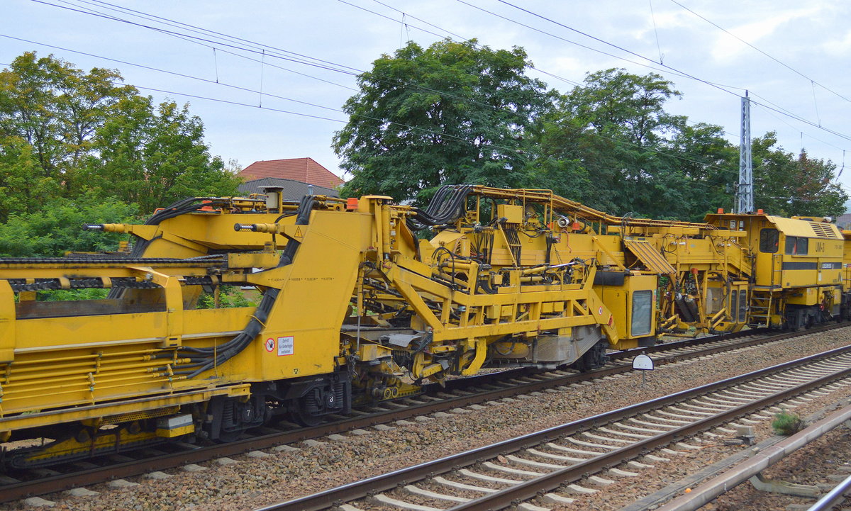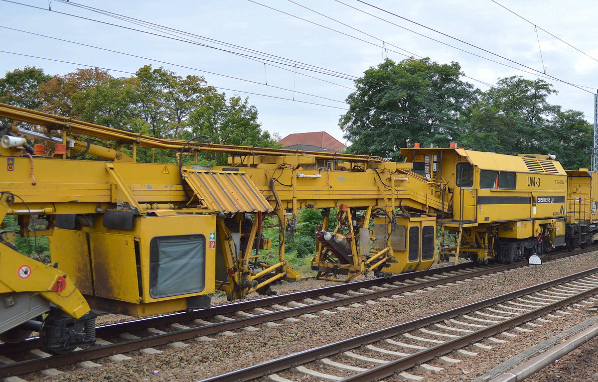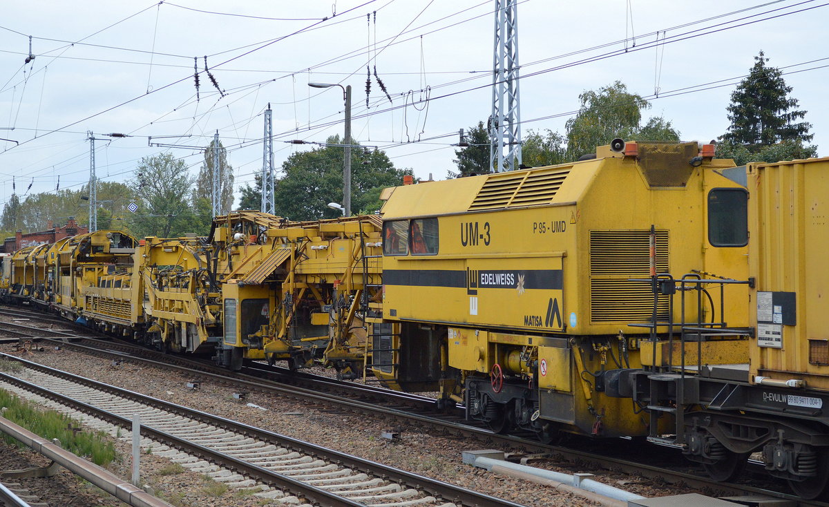 Hier ein Segment des Gleisumbauzuges UM-3 "EDELWEISS" mit der Nr. 99 80 9310 013-4 D-EVULW Krantransport der Fa. LEONHARD WEISS am 23.09.17 Berlin-Köpenick.