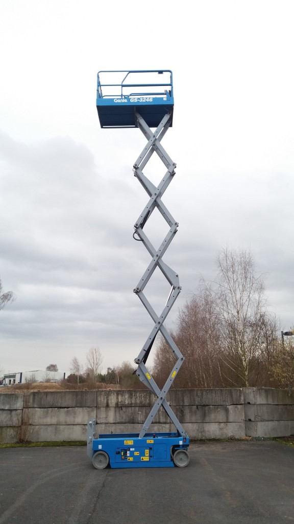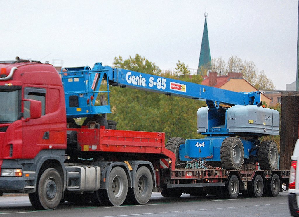 Mobile Hydraulikarbeitsbühne (Mietmaschine) auf einem Tiefladebrückenauflieger vom Hersteller Genie Typ S-85 am 22.10.12 Berlin-Putlitzbrücke. Lothar Stöckmann