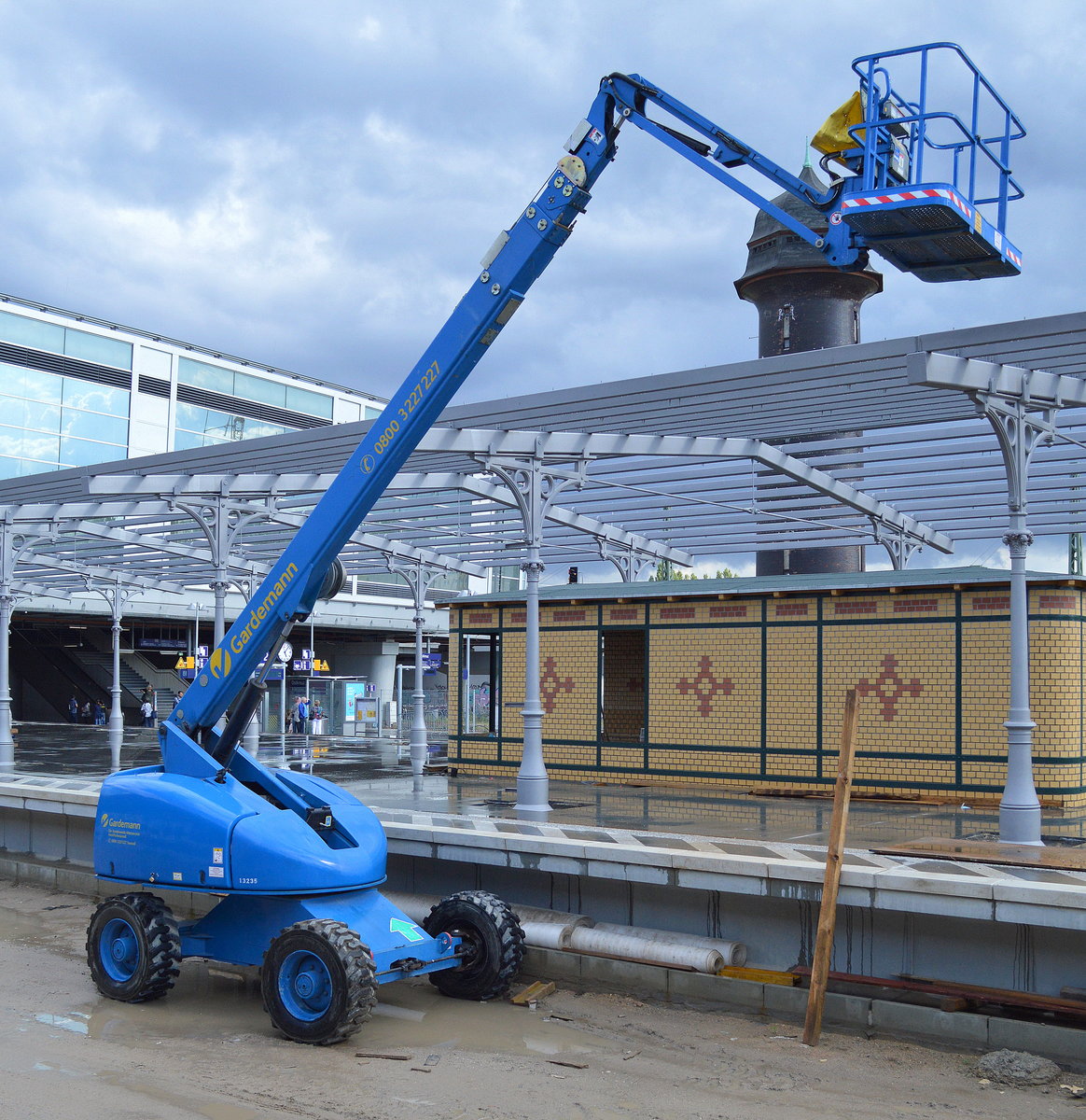 Interessante mobile Arbeitsbühne als Zweiwege-Vehikel mit Raupenuntersatz der Fa. Balfour Beatty im Einsatz auf den Schienen beim Neubau der Fernbahnstrecke zwischen Berlin-Lichtenberg und Grünauer Kreuz gesichtet in Höhe Berlin-Plänterwald am 20.07.15 aus dem S-Bahn Fenster.