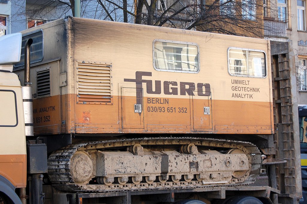 MB 2638 Spezialtrage-LKW der Fa. fugro Berlin für UMWELT GEOTECHNIK ANALYTIK beladen mit einer Spezial-Raupenmaschine, 22.02.11 Berlin Bornholmer Str.