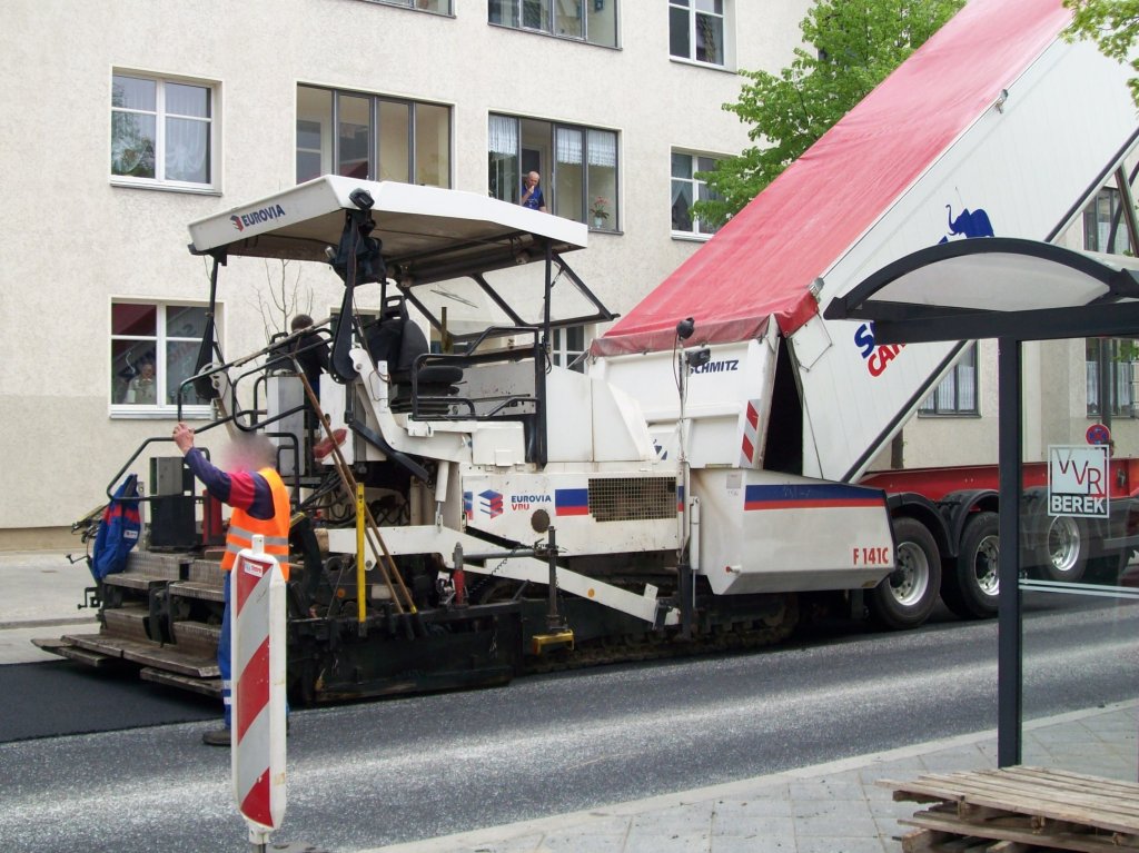 Straßenfertiger DYNAPAC Typ F141C der Baufirma EUROVIA, 11.08.10 Berliner Str. Berlin-Pankow.