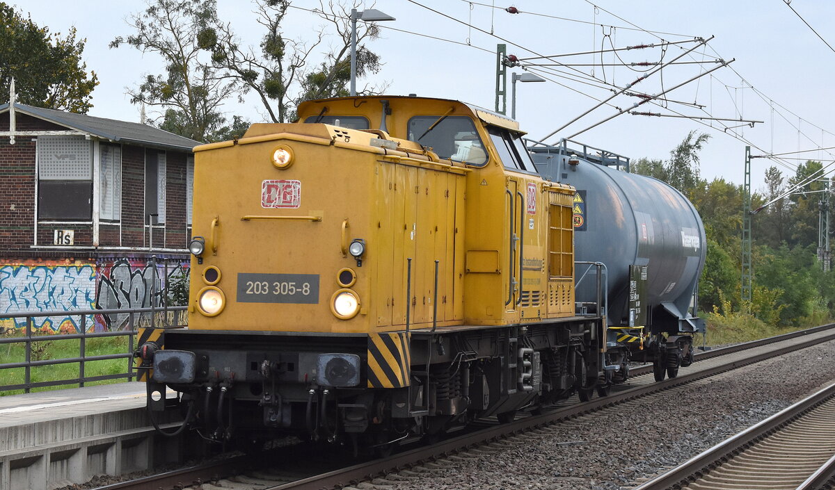 DB InfraGO AG, Frankfurt (Main)/DB Netz Instandhaltung mit ihrer "203 305-8" [NVR-Nummer: 92 80 1203 305-8 D-DBMP] und zwei Drehgestell-Flachwagen am 10.07.25 Durchfahrt Bahnhof Magdeburg-Neustadt.