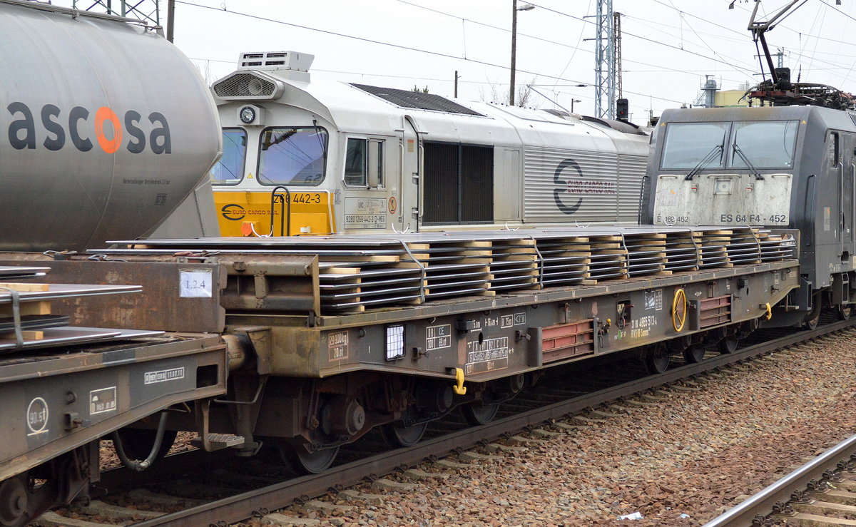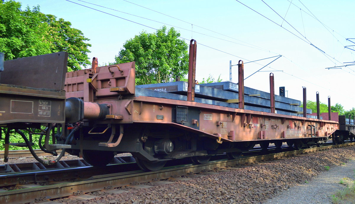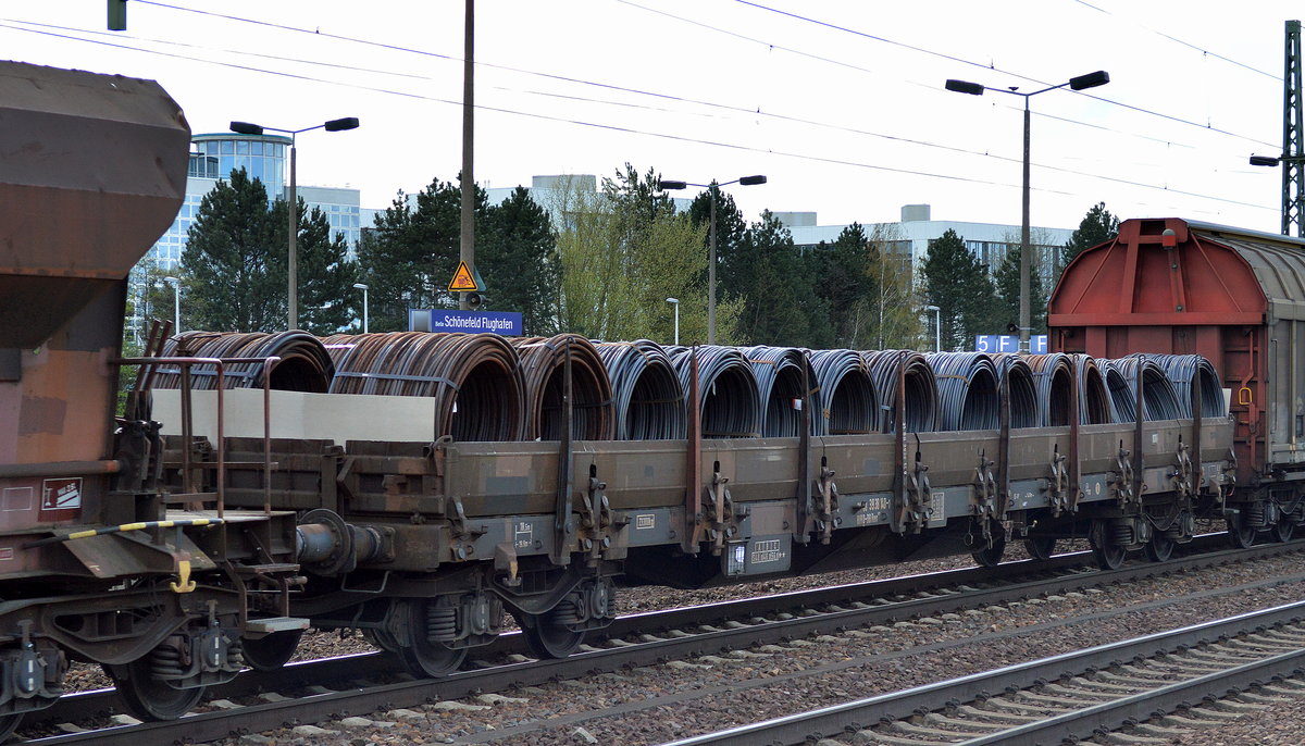 Drehgestell-Flachwagen der DB mit Stahlplatten beladen mit der Nr. 31 RIV 80 D-DB 4864 192-8 Samms 710 am 24.05.16 Bf. Flughafen Berlin-Schönefeld.