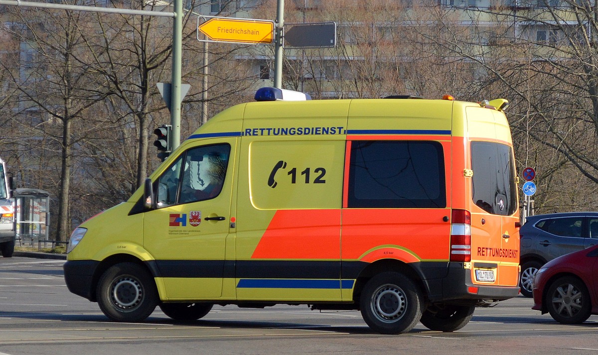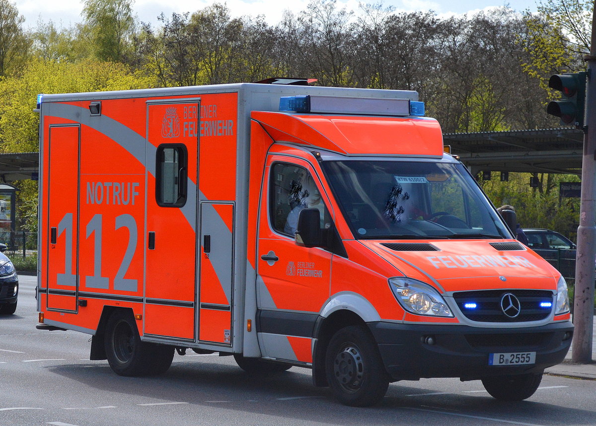 Typische Einsatzsituation bei kleineren Unfällen in Berlin, ein LHF 16/12 City und dahinter ein MB RTW der Berliner Feuerwehr auf dem Weg zur Einsatzstelle, 25.04.09 Berlin-Pankow.