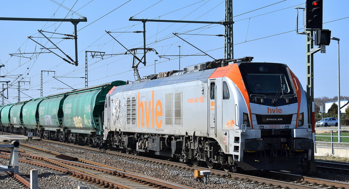 Havelländische Eisenbahn AG, Wustermark [D] mit der geleasten ELP Eurodaul Lok "2159 223-7" [NVR-Nummer: 90 80 2159 223-7 D-ELP] und einem Kalizug (leer ) am 03.06.25 Durchfahrt Bahnhof Stendal Hbf. Vielen Grüße an den Tf- !!!!