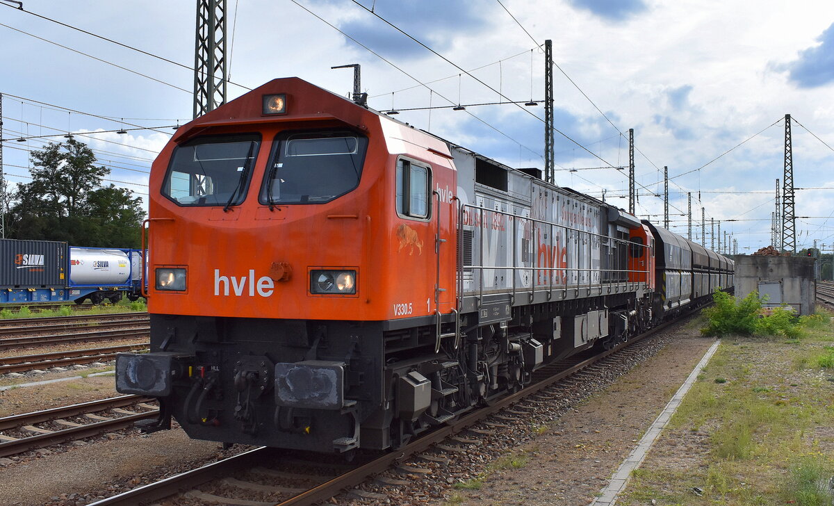 Havelländische Eisenbahn AG, Wustermark [D] mit einem ihrer Tiger leider ohne Frontnummer, daher nicht erkennbar mit einem Ganzzug Selbstentladewagen am 30.07.25 Durchfahrt Bahnhof Ruhland.