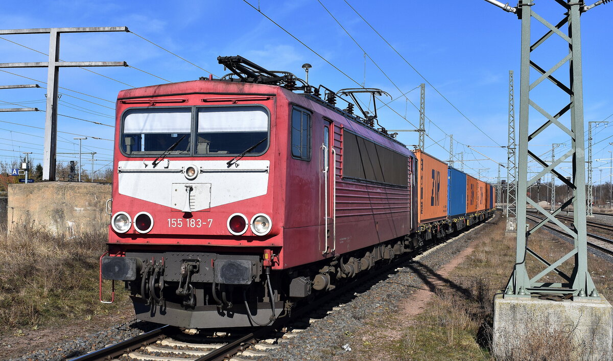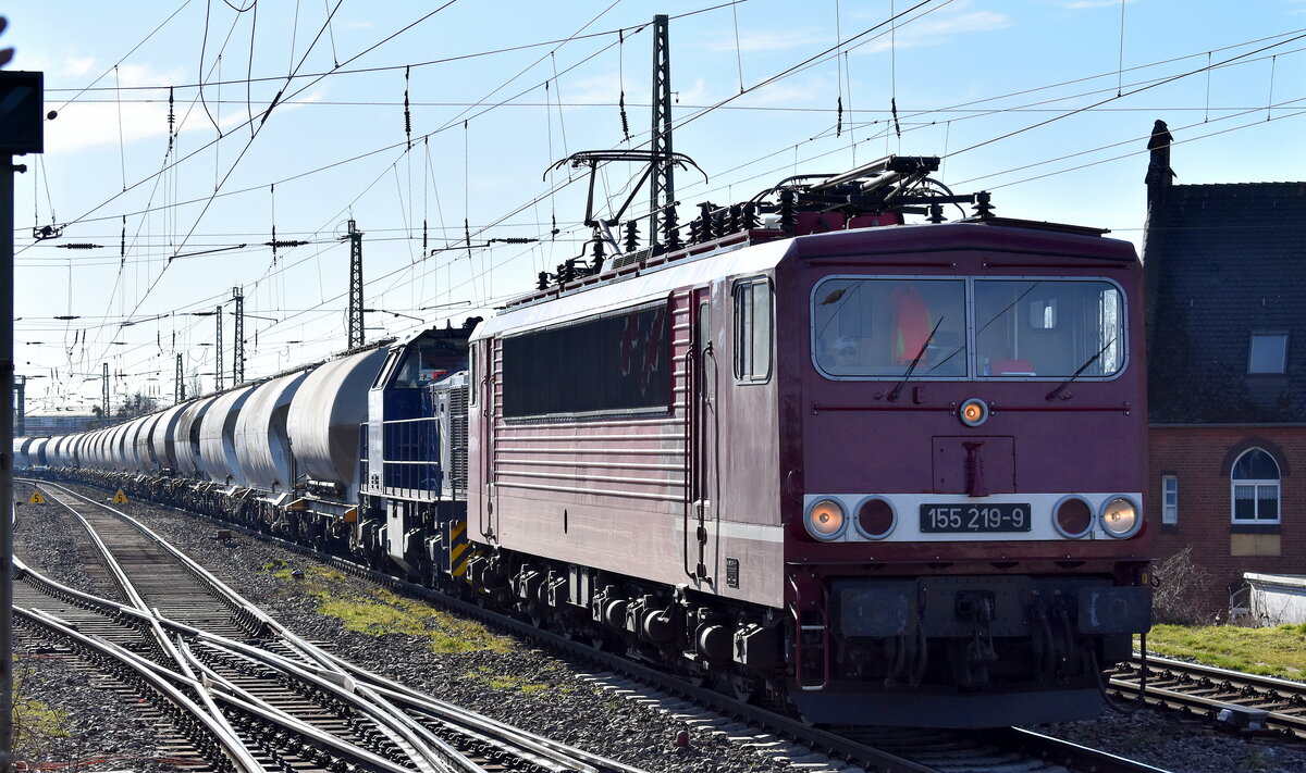 Abstellgruppe mit den Eisenbahnbau- und Betriebsgesellschaft Pressnitztalbahn mbH, Jöhstadt (PRESS) / IntEgro Verkehr GmbH, Neuenmarkt Loks "155 026-2" (NVR: "91 80 6155 211-6 D-PRESS") + dahinter "155 059-2" (NVR: "91 80 6155 204-1 D-PRESS") am 06.03.25 Höhe Bahnhof Stendal Hbf.