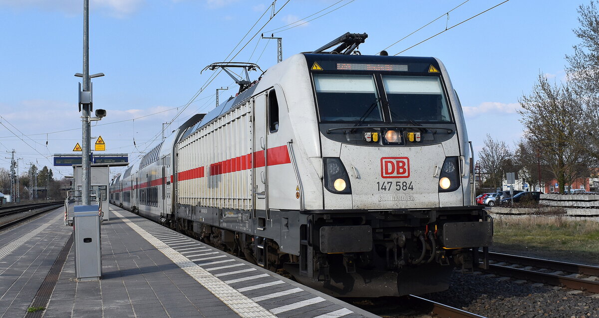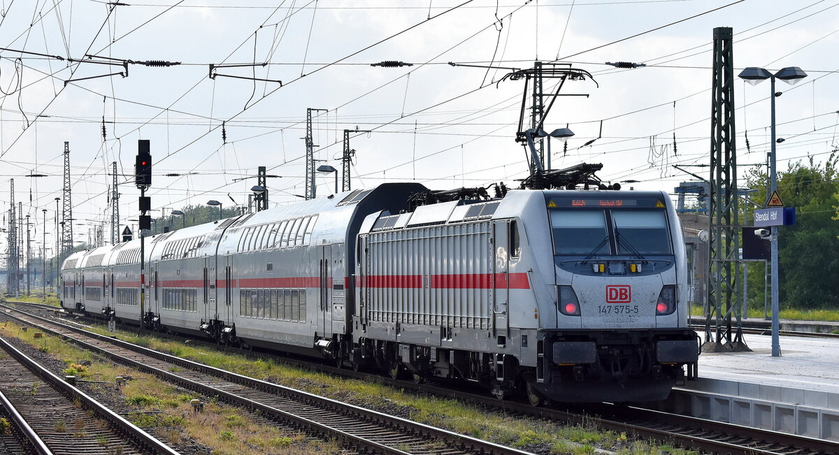DB Fernverkehr AG [D] mit ihrer "147 572-2" [NVR-Nummer: 91 80 6147 572-2 D-DB] als Schublok eines Steuerwagen-IC Richtung Köln am 08.05.25 Durchfahrt Bahnhof Stendal Hbf.
