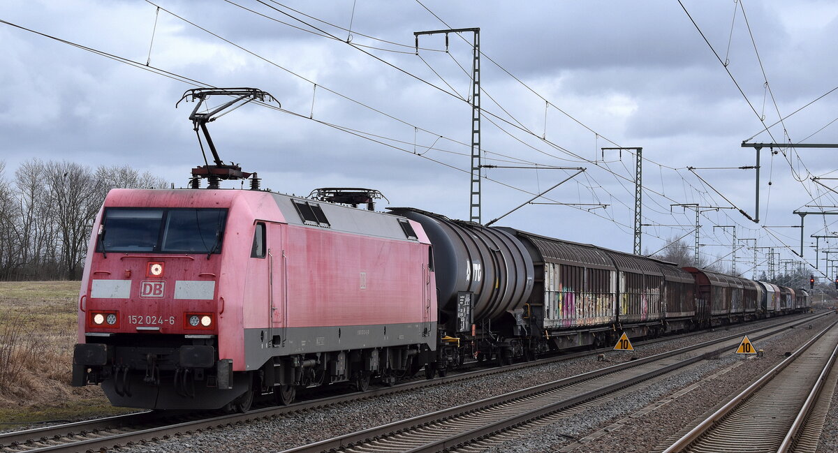 DB Cargo AG, Mainz [D] mit ihrer "152 019-6" [NVR-Nummer: 91 80 6152 019-6 D-DB] und einem Ganzzug gedeckter Schüttgutwagen am 06.11.25 Höhe Bahnhof Magdeburg-Neustadt.