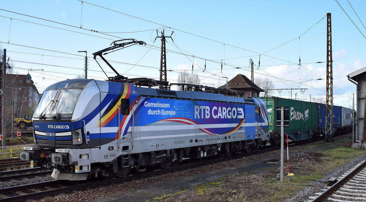 RTB CARGO GmbH, Düren [D] mit der geleasten ELL Vectron "193 726" [NVR-Nummer: 91 80 6193 726-7 D-ELOC] und einem Containerzug am 24.09.25 Höhe Bahnhof Rodleben.