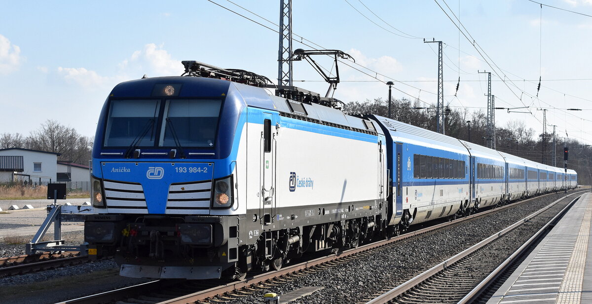 ČD - České dráhy a.s., Praha [CZ] mit ihrer Vectron "6193 568" [NVR-Nummer: 91 80 6193 568-3 D-CD] und einem EC Richtung Prag am 23.03.26 Durchfahrt Bahnhof Elsterwerda.