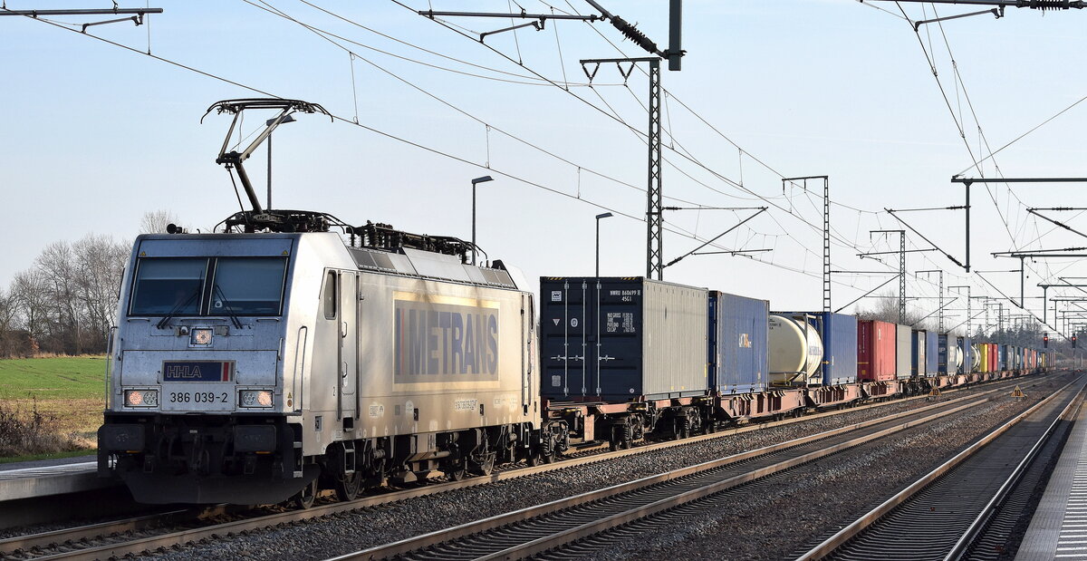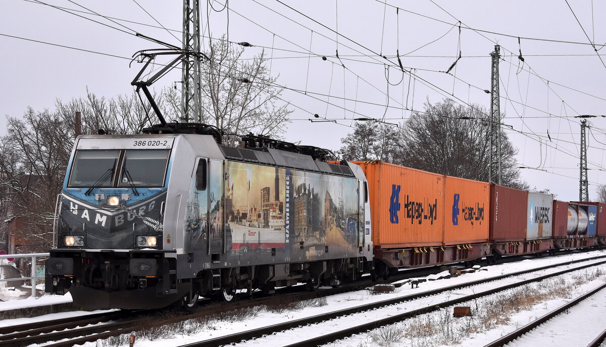 METRANS Rail s.r.o., Praha [CZ] mit ihrer "386 027-7" [NVR-Nummer: 91 54 7386 027-7 CZ-MT] und einem Containerzug am 04.11.25 Durchfahrt Bahnhof Roßlau (Elbe).