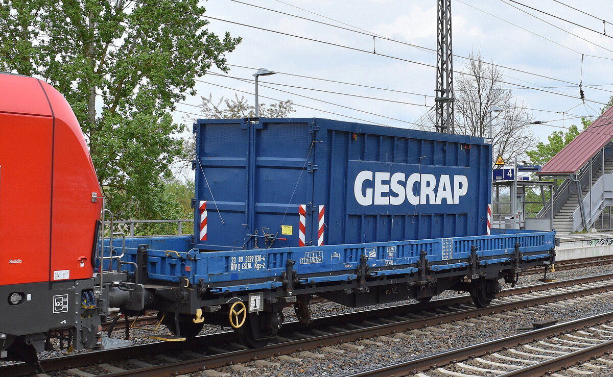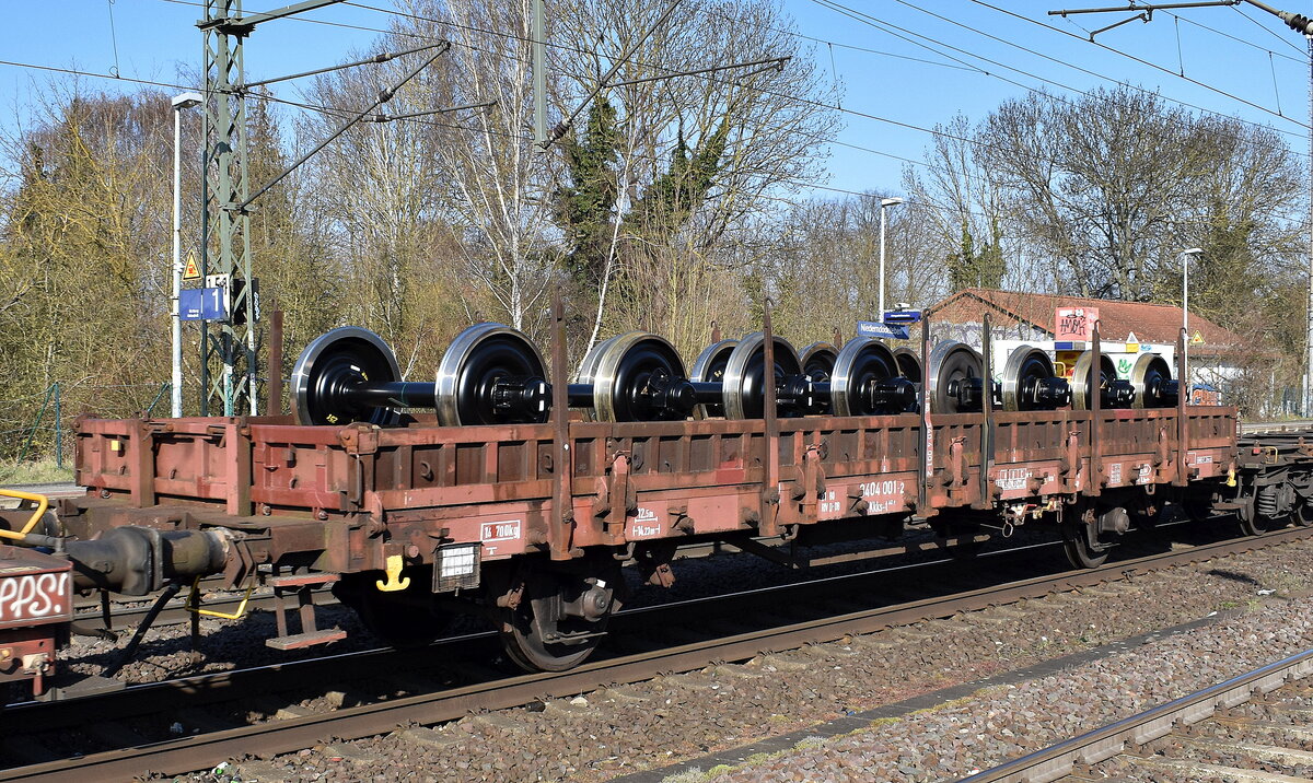 Zwei Niederbordwagen mit Rungen und jeweils zwei Radsätzen, wahrscheinlich auch als Pufferwagen für Überführungsfahrten des Bombardierwerkes in Hennigsdorf im Einsatz, 29.01.11 Hennigsdorf Bhf.