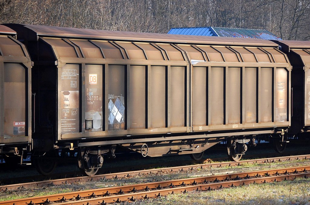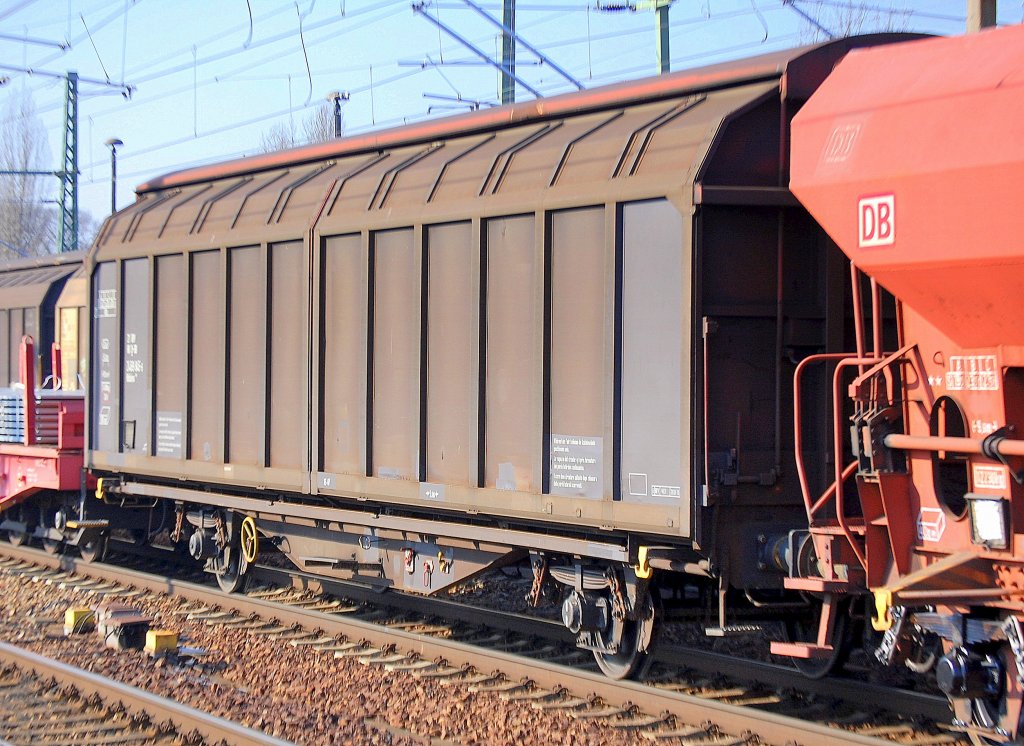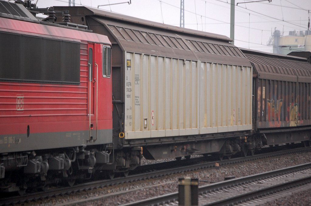 TRANSWAGGON Schiebewandwagen eingestellt in Deutschland mit der Nr. 33 RIV 80 D-TWA 2744 281-7(P) Habiins 3 Bf. Maschen Rbf. Ladegut: Kartonagen und andere Güter, 12.08.11 Bhf. Flughafen Berlin-Schönefeld.
