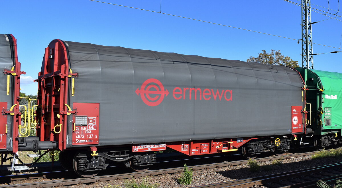 Französischer Drehgestellflachwagen mit vier Radsätzen, verschiebbarem Planenverdeck und Lademulden für Coil-/Spaltbandtransporte vom Einsteller ERMEWA SA it der Nr. 33 TEN 87 F-ERSA 4669 769-1 Shimmns (GE) in einem gemischten Güterzug am 27.03.25 Höhe Bahnhof Niederndodeleben.