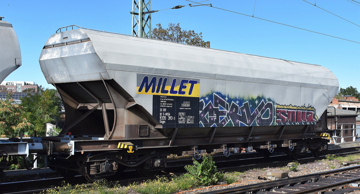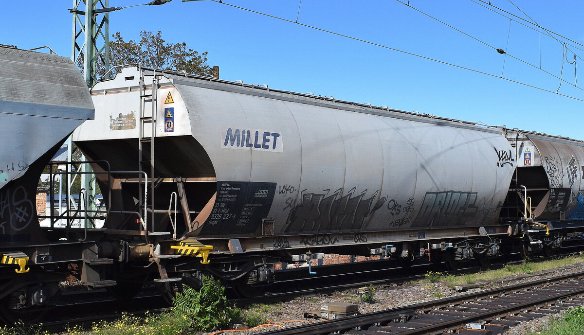 Drehgestell-Staubgutwagen vom Einsteller VTG (ehemals EVS) mit französischer Registrierung mit der Nr. 33 RIV 87 F-VTG 9326 838-8 Uacns in einem Staubgutzug am 08.12.25 Höhe Bahnhof Magdeburg-Neustadt.