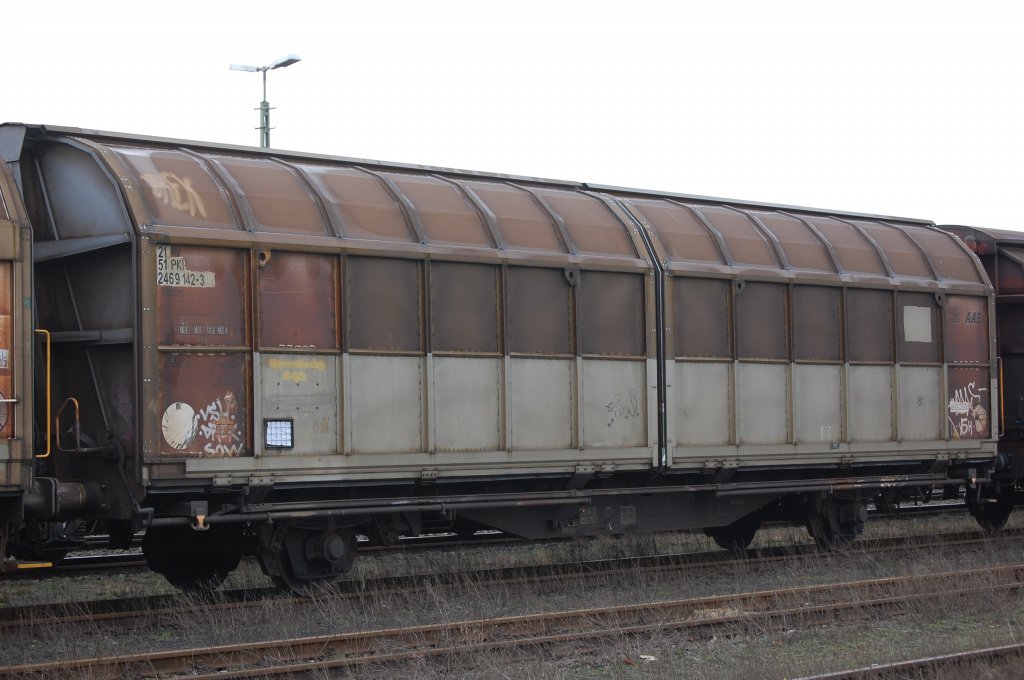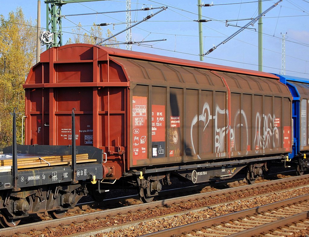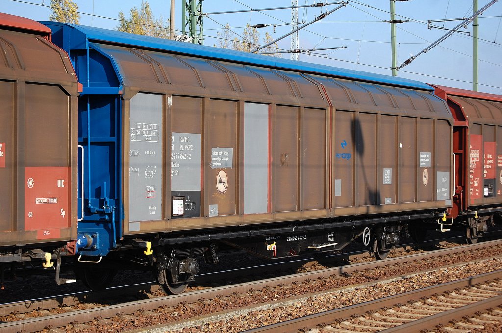 Polnische Schiebewandwagen der PKP Cargo, im Bild der Wagen mit der Nr. 31 RIV MC 51 PL-PKPC 2715 183-7 Hais 412Ks in einem Ganzzug im Bahnhof Kostrzyn nad Odrą (oben).
