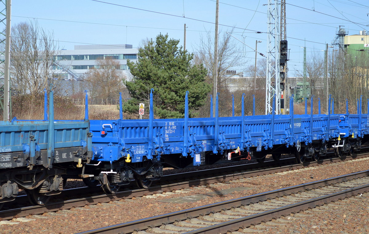 Ein polnischer Drehgestellflachwagen der PKP-Cargo mit Stahllatten beladen eingestellt mit der Nr. 31 RIV-MC 51 PL-PKPC 394 6 890-6 Res 2151, 06.03.12 Bhf. Flughafen Berlin-Schönefeld.