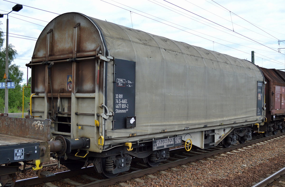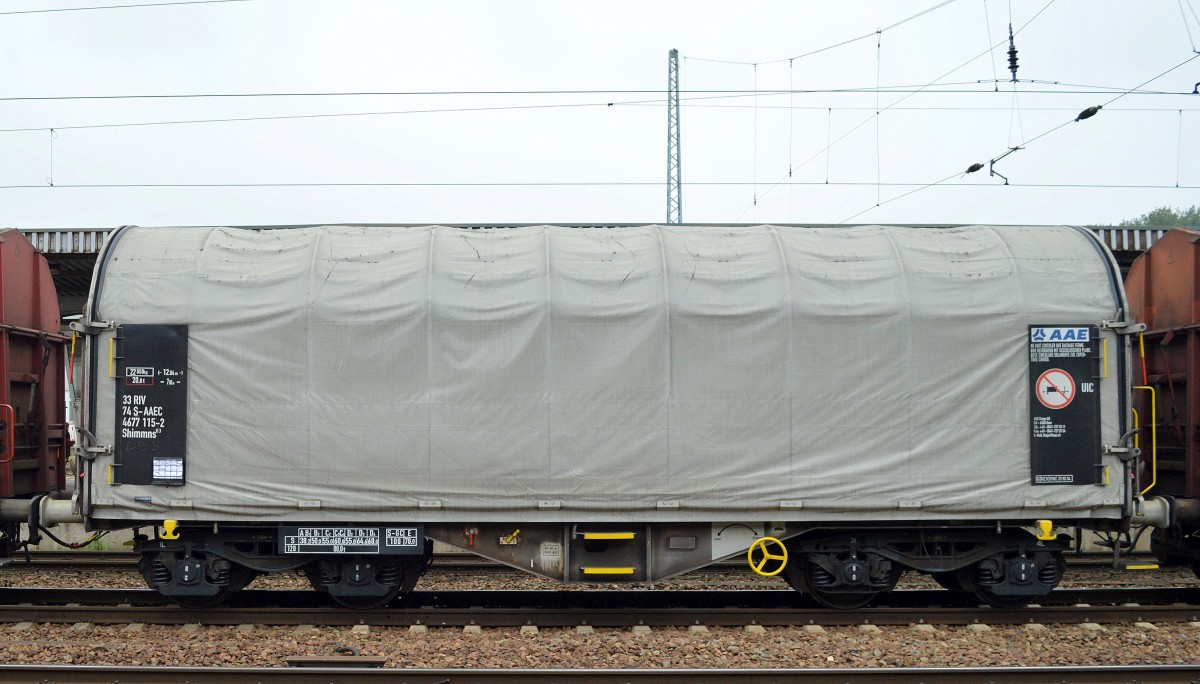 Schwedischer Drehgestell-Flachwagen mit Schiebeplane für Coiltransporte vom Einsteller AAE Cargo mit der Nr. 33 RIV 74 S-AAEC 4677 138-4 Shimmns 63 am 09.11.15 Bhf. Flughafen Berlin-Schönefeld.