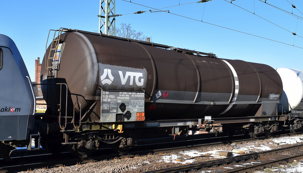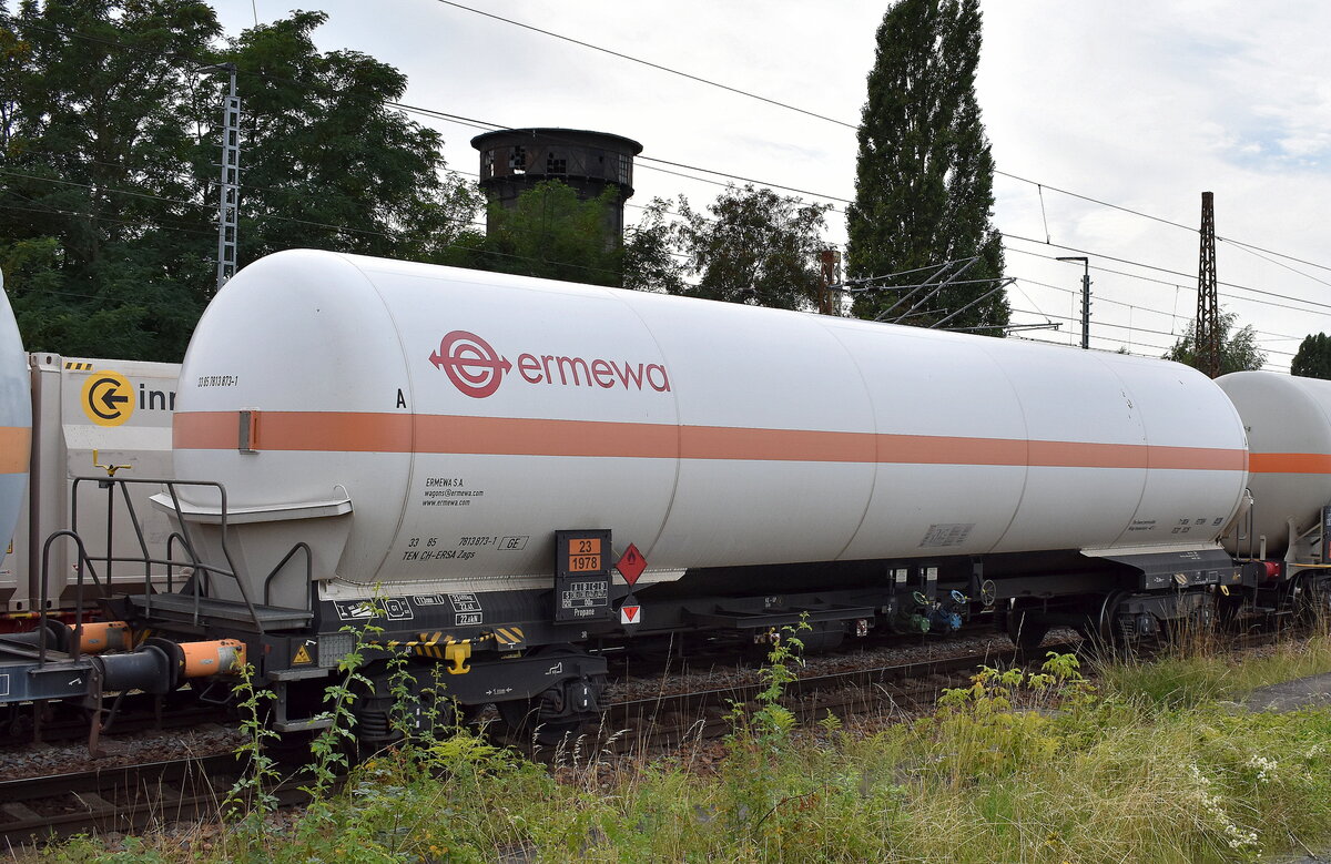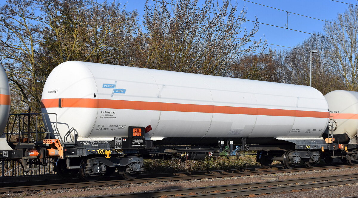 Gasdruckkesselwagen der Fa. Aretz GmbH & Co.KG eingestellt in der Schweiz mit der Nr. 33 TEN-RIV 85 CH-ARETZ 7813 198-3 Zags Bf.Krefeld Hfb. (23/1965 Kohlenwasserstoffgas, Gemisch C) am 06.02.15 Bhf. Flughafen Berlin-Schönefeld.
