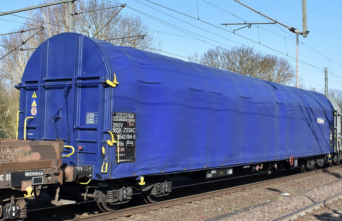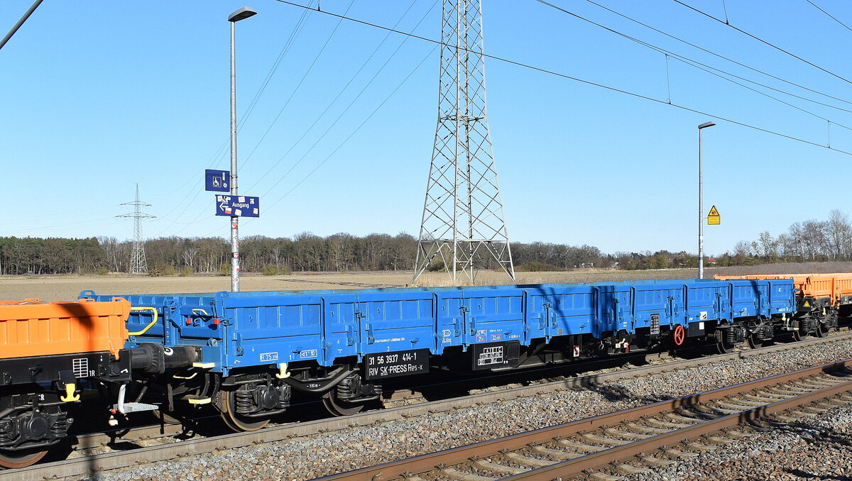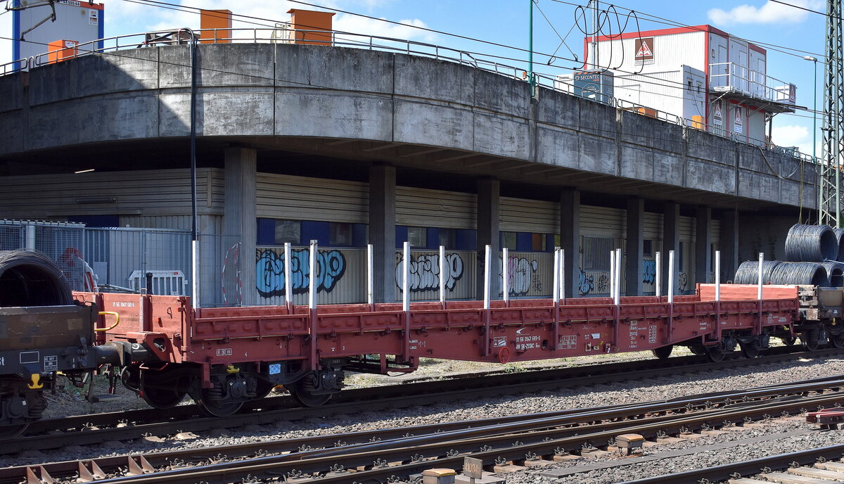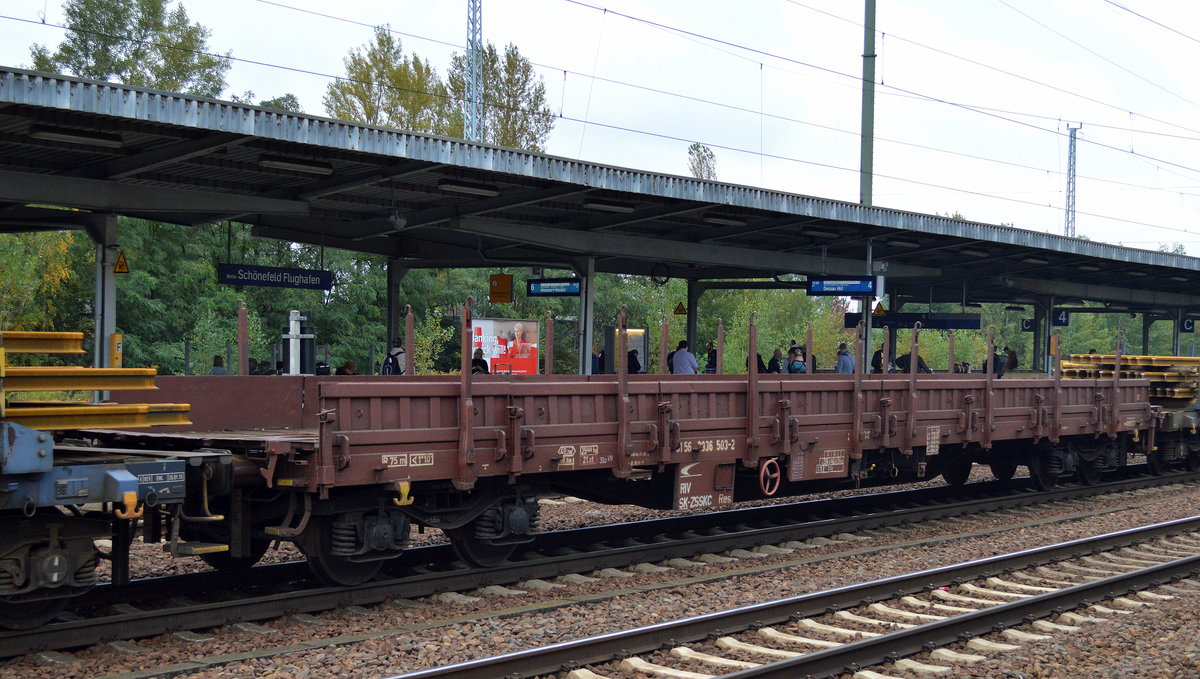 Ein Drehgestell-Flachwagen im Einsatz als Schutzwagen eines Gleisbauschienenkranes (GOTTWALD GS 40.08T) mit der slowakischen Zulassung 33 RIV 56 SK-TTKOL (Track Tec Koltram Sp.z.o.o.) 3997 021-9 Res am 09.09.14 Bhf. Flughafen Berlin-Schönefeld.
