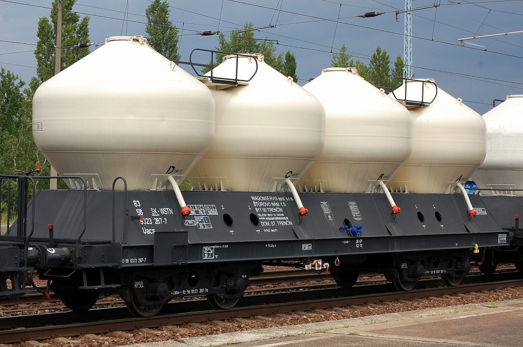 Ein slowakischer Drehgestell-Staubgutwagen der Fa. FORTISCHEM a.s mit der Nr. 33 TEN 56 SK-NCHZ 9316 012-9 Uacns (GE) für die Befüllung mit Calciumcarbid (UN-Nr: X423/1402) in einem gemischten Güterzug am 17.06.25 Höhe Bahnhof Senftenberg.