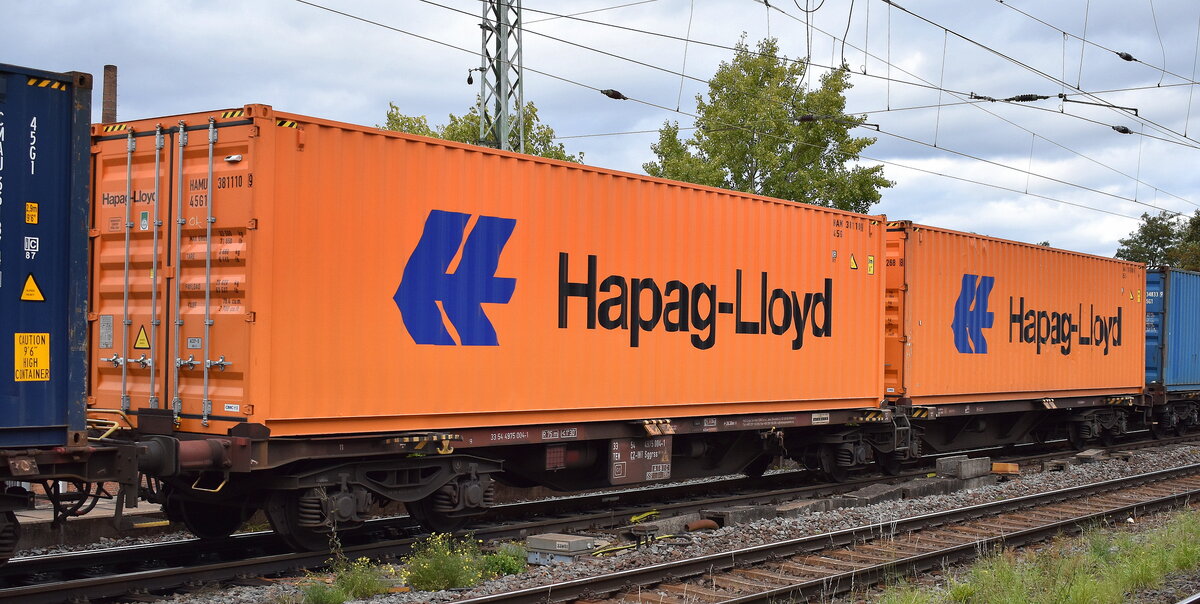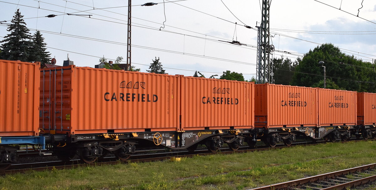 Gelenk-Containertragwagen vom Einsteller METRANS (Tschechien) mit der Nr. 31 TEN 54 CZ-MT 4803 013-0 Sggrss mit zwei interessanten flachen Containern mit Plane abgedeckt in einem Containerzug am 01.08.25 Höhe Bahnhof Niederndodeleben.