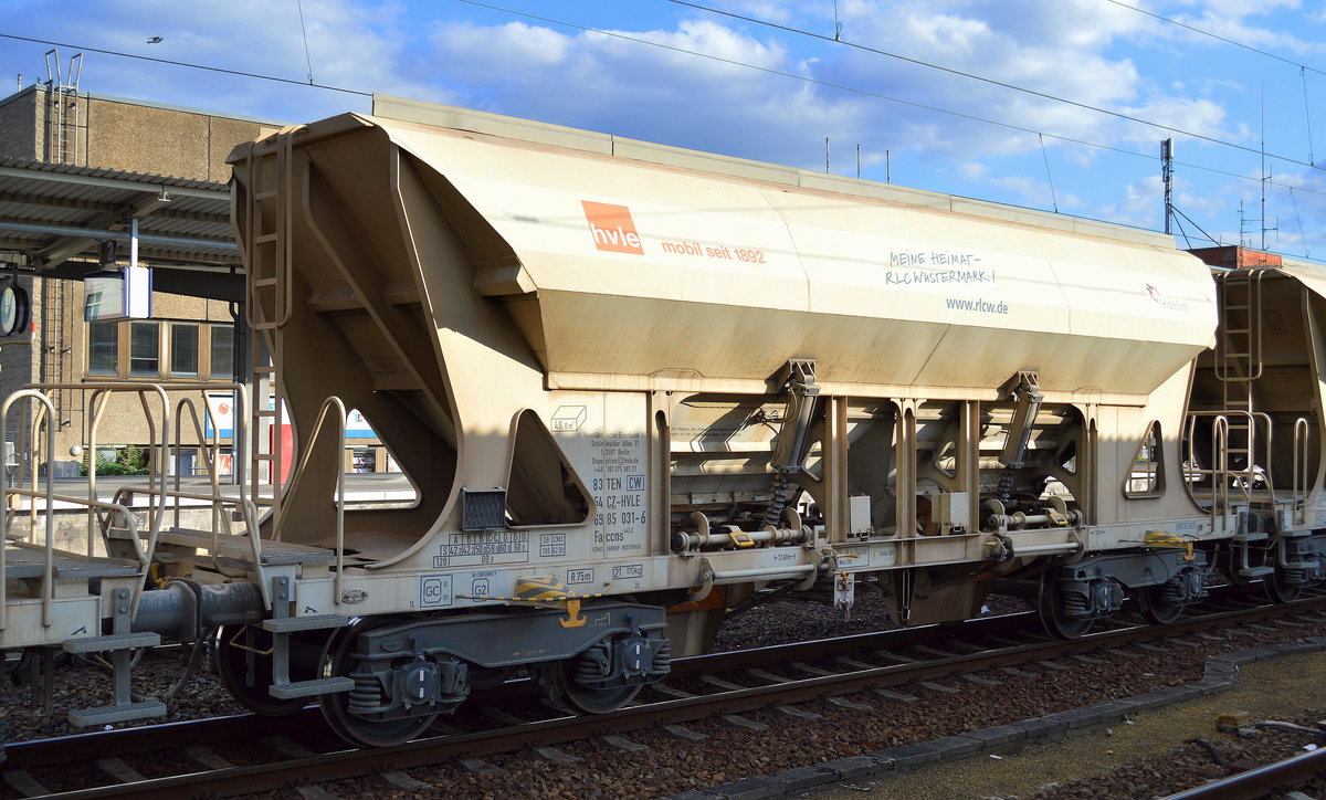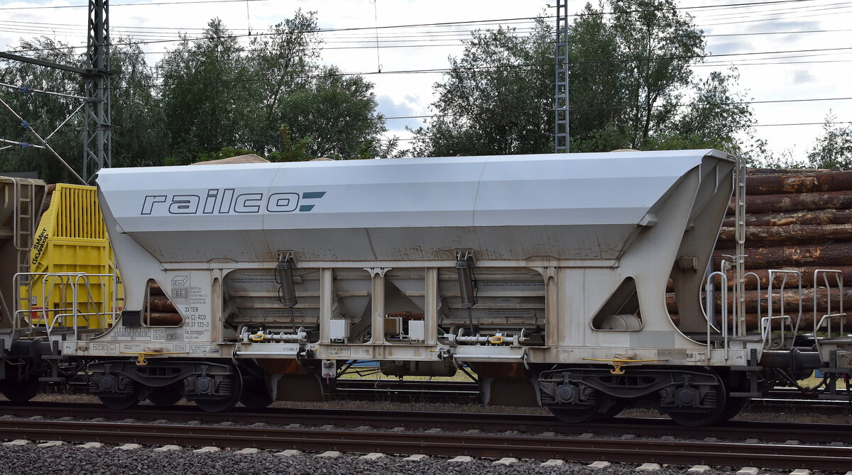 Drehgestell-Schüttgutwagen mit dosierbarer Schwerkraftentladung vom Einsteller ERMEWA SA zum Transport von Baustoffgütern (Sand/Kies) für Captrain/EUROVIA mit tschechischer Registrierung mit der Nr. 38 TEN 54 CZ-ERSA 6985 310-4 Faccns in einem Ganzzug am 10.07.25 Höhe Bahnhof Magdeburg Hbf.