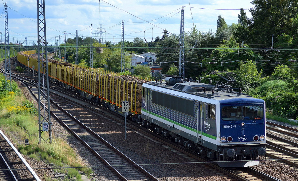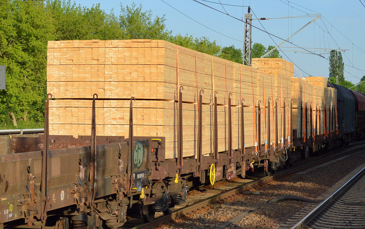 Die im Moment meist benutzten Drehgestell-Flachwagen mit Niederbindeeinrichtungen vom Einsteller TRANSWAGGON für Stammholz-Transporte, im Bild der Wagen mit der Nr. 81 TEN 80 D-TWA 4723 016-9 Snps am 04.04.17 Berlin-Hohenschönhausen.