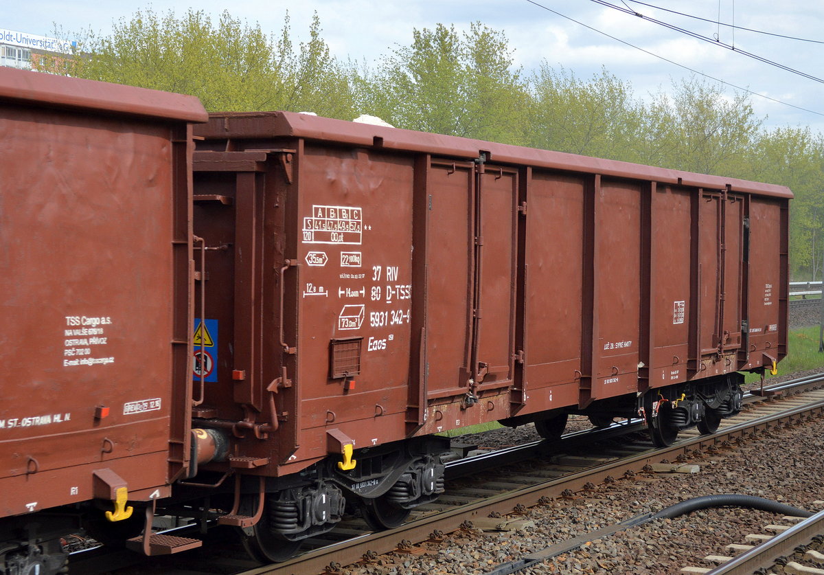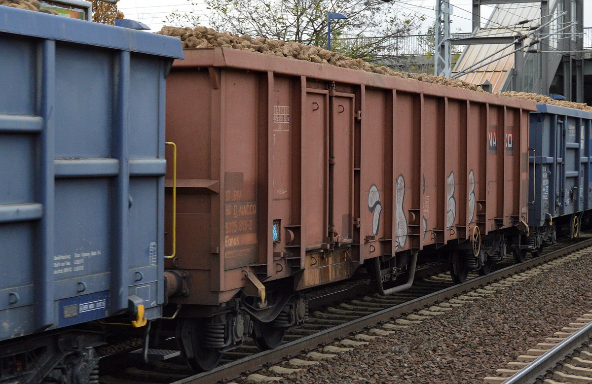 Blauer offener Drehgestell-Güterwagen vom Einsteller ERR GmbH mit der Nr. 37 TEN 80 D-ERR 5932 130-7 Eanos Bf. Duisburg-Hafen beladen mit Zuckerrüben am 12.11.17 Bf. Berlin-Hohenschönhausen.