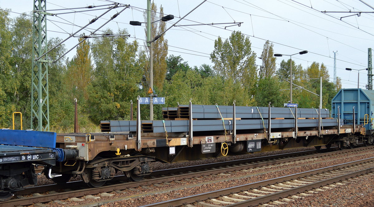 Sechsachsiger Drehgestell-Flachwagen der PKP Cargo mit der Nr. 31 RIV MC 51 PL-PKPC 4861 550-5 Samms 2151 beladen mit Stahlpaltten am 03.03.17 Bf. Flughafen Berlin-Schönefeld.