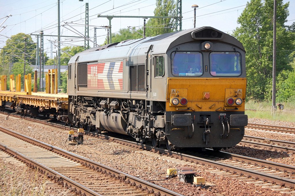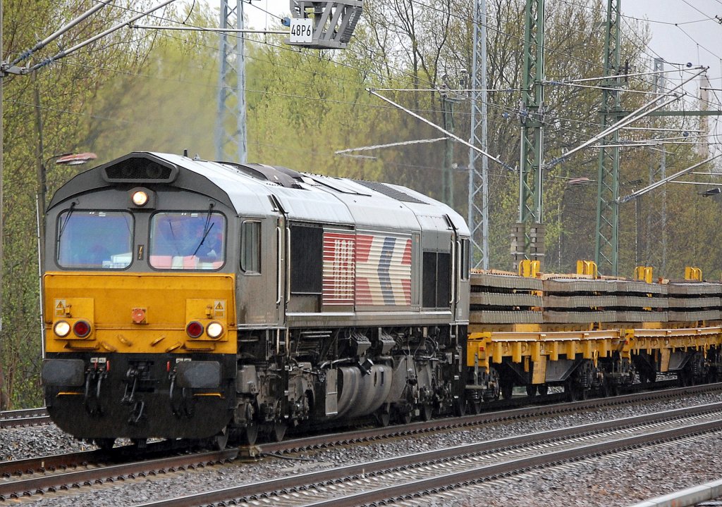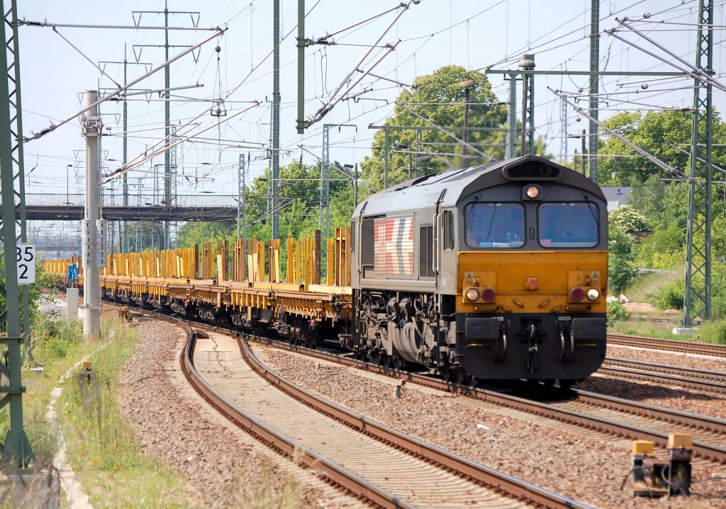 Claas 66 MRCE Dispolok für ? tätig mit Ganzzug Oberbaustofwagen mit Fertiggleissegmenten beladen bei der Durchfahrt im Bhf. Flughafen Berlin-Schönefeld, 30.09.10